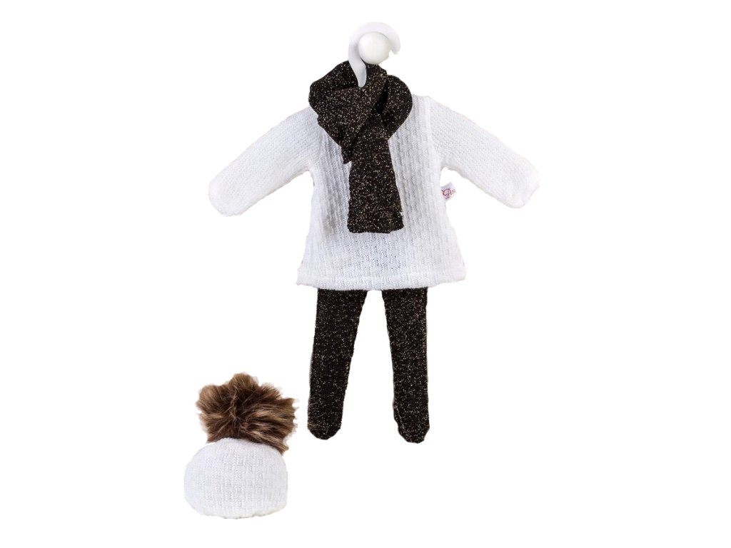 Súprava sa skladá z bielych pletených šiat a čiernych pančúch zdobených zlatou niťou. Aby sa oblečenie pohodlne nosilo, výrobca vybavil šaty zapínaním na suchý zips. Oblečenie doplní hrejivá čierna šatka a čiapka s malým brmbolcom. Módny styling sa bude páčiť malým módnym nadšencom a je vhodný na všetky druhy výletov.