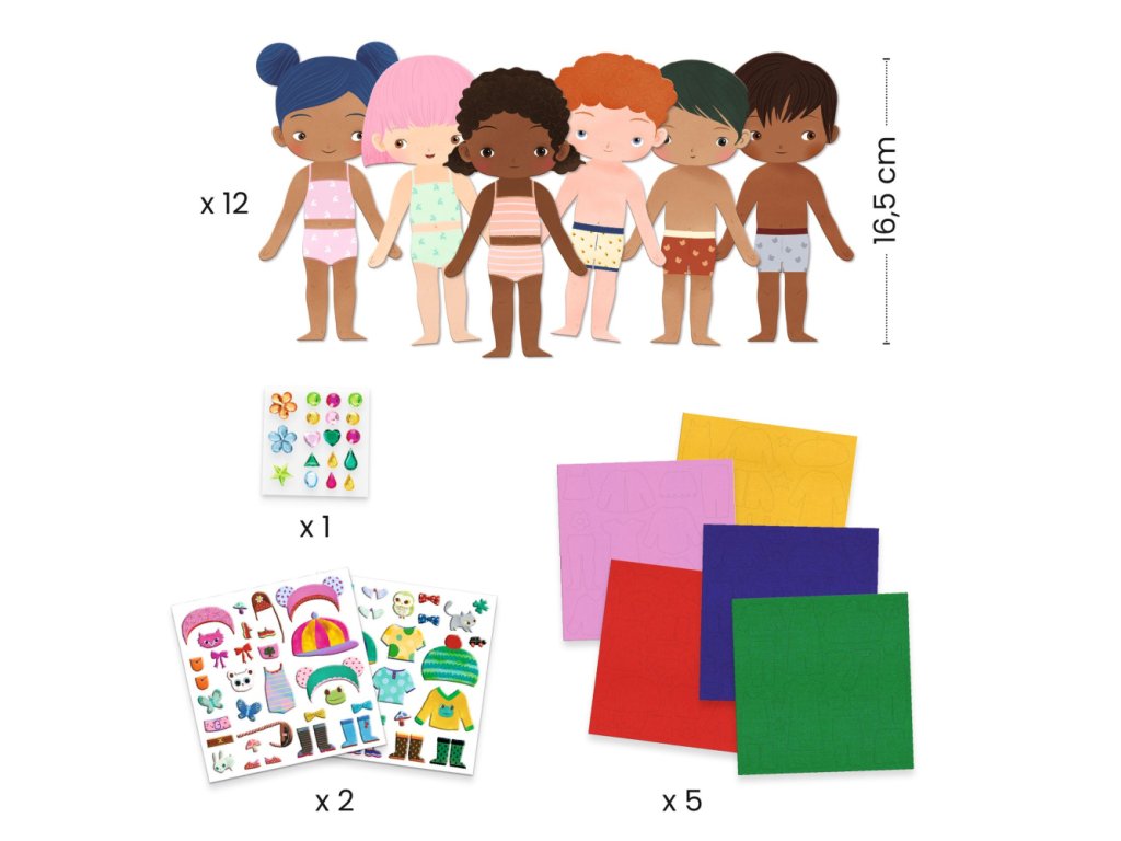 Obliekanie 12 postáv plstennými nálepkami Vstúpte do sveta módy s kreatívnou sadou pre najmenších! Prineste deťom radosť z kreatívneho obliekania s touto nádhernou sadou od DJECO, ktorá je ideálna pre deti od 3 do 6 rokov! Sada obsahuje 12 postáv (6 chlapcov a 6 dievčat) z hrubého kartónu, ktoré deti môžu obliekať pomocou farebnej samolepiacej plsti a nálepiek. Deti môžu skúšať rôzne kombinácie a tvoriť jedinečné outfity pre každú postavu. Táto aktivita nielenže zábavnou formou rozvíja jemnú motoriku a kreativitu, ale tiež umožňuje deťom experimentovať s farbami a vzormi. Sada je vyrobená z papiera a kartónu s FSC® certifikátom, čo zaručuje ekologický prístup a podporu udržateľnosti.S kreatívnou sadou DJECO sa deti zabavia dlhé hodiny a môžu si vytvárať príbehy so svojimi oblečenými postavami. Tento set je skvelou voľbou pre malých módnych nadšencov a je perfektným darčekom pre každú príležitosť!Obsah sady:12 stojacich postáv z hrubého kartónu5 listov samolepiacej plsti2 hárky nálepiek1 farebný návodDodatočné parametre