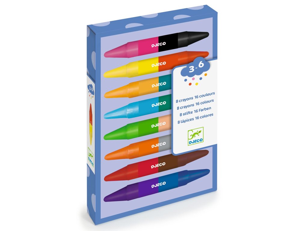 Obojstranné pastelky 8 ks/16 farieb Dvojnásobná paleta farieb v kompaktnom baleníObojstranné pastelky sú praktická a kreatívna pomôcka pre deti, ktoré rady kreslia, vyfarbujú a experimentujú s farbami. Každá pastelka má dve rôzne farby, vďaka čomu ponúka balenie až 16 odtieňov v kompaktnom a ľahko prenosnom formáte.Pastelky majú kvalitnú farebnú stopu, dobre sa držia v ruke a umožňujú plynulé kreslenie aj vyfarbovanie väčších plôch. Sú ideálne na doma, do školy aj na cesty a podporujú rozvoj kreativity, jemnej motoriky a cit pre farby.Pre koho sú vhodné: odporúčaný vek: od 3 rokov pre deti, ktoré rady kreslia, maľujú a vyfarbujú ideálne ako základná výtvarná pomôcka vhodné na doma, do škôlky, školy aj na cestyHlavné benefity 8 obojstranných pasteliek = 16 rôznych farieb kompaktné balenie – viac farieb v menšom priestore kvalitná farebná stopa a plynulé kreslenie podporujú kreativitu, jemnú motoriku a cit pre farby kvalitné spracovanie typické pre značku DjecoObsah balenia 8× obojstranná pastelka (16 farieb)Dodatočné parametre