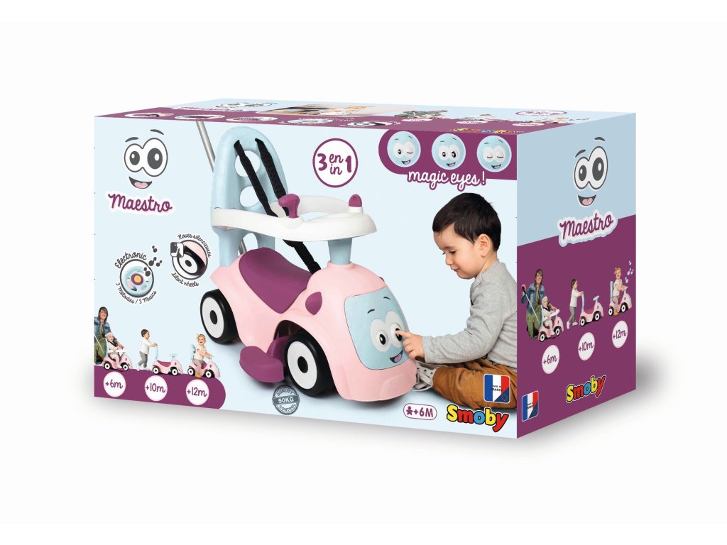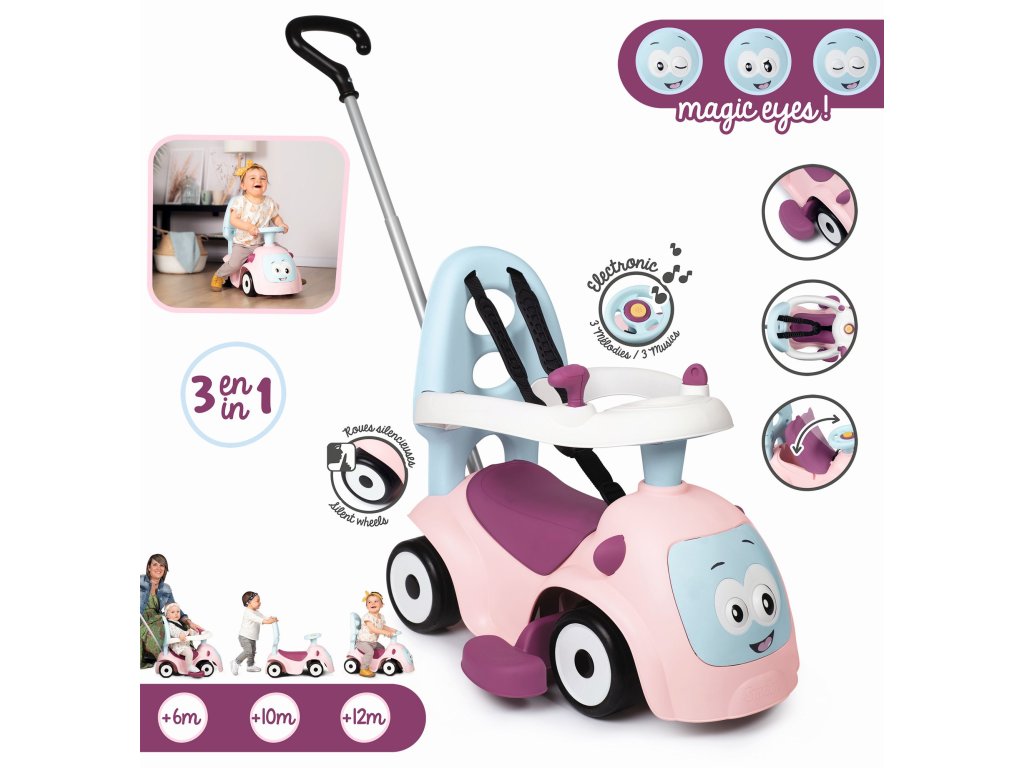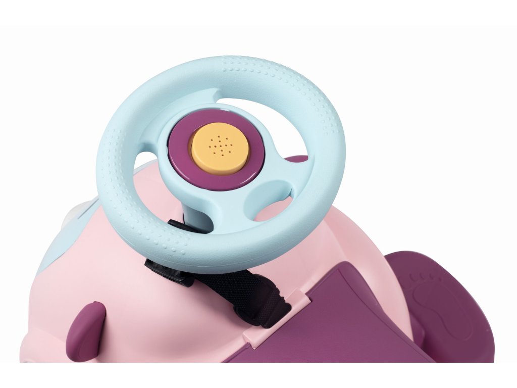 Odrážadlo pre najmenších, ktoré porastie s dieťaťom. Odnímateľné rodičovské madlo, odnímateľný ochranný rám a bezpečnostný pás pre najmenšie deti. Volant so zvukmi - 3 zvukové efekty, tiché kolieska, pohyblivá očíčka. Hmotnosť: 3,555 kg. Rozmery: 61 x 55 x 44 cm.Dodatočné parametre
