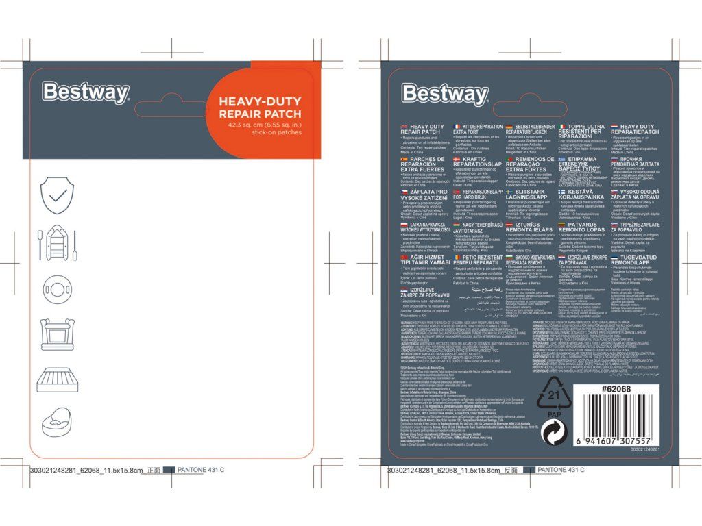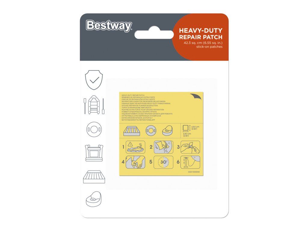 Sada opravných záplat na nafukovací produkty. Jsou ideální pro opravení nafukovacích bazénů, matrací a jiných nafukovacích produktů. Sada obsahuje 10 ks samolepicích opravných záplat o rozměru 6,5 x 6,5 cm. Jsou voděodolné, proto se nemusíte obávat jejich použití, pokud bude bazén naplněný vodou. Rozměry: 11,5 x 15,8 x 0,5 cmDodatočné parametre