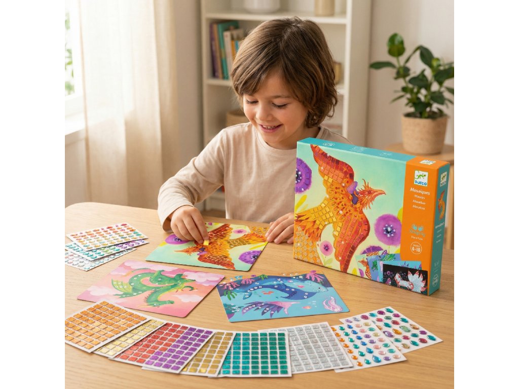 Penová mozaika Mýtické stvorenia Tvorba podľa čísel Magické bytosti, ktoré sa trblietajú: nalep penové mozaikové štvorčeky podľa čísel a vytvor 4 žiarivé obrázkyPenová mozaika Mýtické stvorenia Tvorba podľa čísel je kreatívna sada, v ktorej deti dopĺňajú fantazijné motívy pomocou samolepiacich penových mozaikových dielikov.Na kartách sú vyznačené políčka s číselným kódom – dieťa nájde rovnaké číslo na hárkoch mozaiky a nalepí správnu farbu na správne miesto.Postupne tak vzniknú 4 detailné obrázky mýtických bytostí, ktoré pôsobia plasticky a farebne.Rýchly prehľad odporúčaný vek: 6–10 rokov rozvíja: jemnú motoriku, presnosť, sústredenie, vnímanie farieb a čísel v balení: 4 ilustrované karty 20 × 20 cm, 12 hárkov penových samolepiek, farebný návodPrečo si ju deti zamilujú tvorenie podľa čísel je jednoduché a upokojujúce penové dieliky sa dobre držia a lepia – ideálne pre malé prsty dieťa si trénuje presnosť a dokončovanie úloh krok po kroku hotové obrázky sú krásne ako dekorácia alebo darčekAko to funguje Vyber jednu kartu a pozri si očíslované políčka. Nájdi na hárku samolepiek farbu s rovnakým číslom. Odlep penový štvorček a nalep ho na správne miesto. Pokračuj, kým nebude obrázok celý vyplnený.Obsah balenia 4× ilustrovaná karta (20 × 20 cm) 12× hárok penových samolepiek (mozaikové štvorčeky) 1× farebný návod krok za krokomTechnické parametre materiál: kartón, penové samolepiace dieliky počet obrázkov: 4 rozmer obrázkov: 20 × 20 cm rozmery balenia: cca 21,5 × 21,5 × 4 cm odporúčaný vek: 5–8 rokovDodatočné parametre
