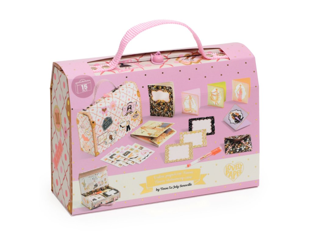 Písacia sada v kufríku ružovýElegantné a praktické kufríkové puzdro Objavte kufríkové puzdro Tinou od DJECO z kolekcie LOVELY PAPER. Tento dizajnový a ľahko prenosný „kufrík“ je vyrobený z pevného kartónu a disponuje unikátnym zapínaním s drevenou guľôčkou a gumičkou. Je to skutočná truhlica s pokladom pre milovníkov kvalitného papierenského tovaru – ideálne na písanie, kreslenie alebo posielanie správ. Komplexná sada papierenských potrieb 1 zápisník 1 poznámkový blok 1 ružové gélové pero 4 obálky 4 pozvánky 4 listy nálepiek Sada podporuje kreativitu a umožňuje zaznamenávať všetky inšpirácie štýlovo a prakticky. Hodí sa ako doplnok ku knižkovému puzdru Tinou. Ekologické a bezpečné materiály Vyrobené z papiera a kartónu s certifikátom FSC®, s dôrazom na kvalitu, bezpečnosť a ekologickú zodpovednosť. Technické informácie Rozmery produktu (aj balenia): 18 x 13,5 x 6 cm Vhodné pre deti aj dospelých, ktorí milujú štýlové a praktické papierenské doplnkyDodatočné parametre