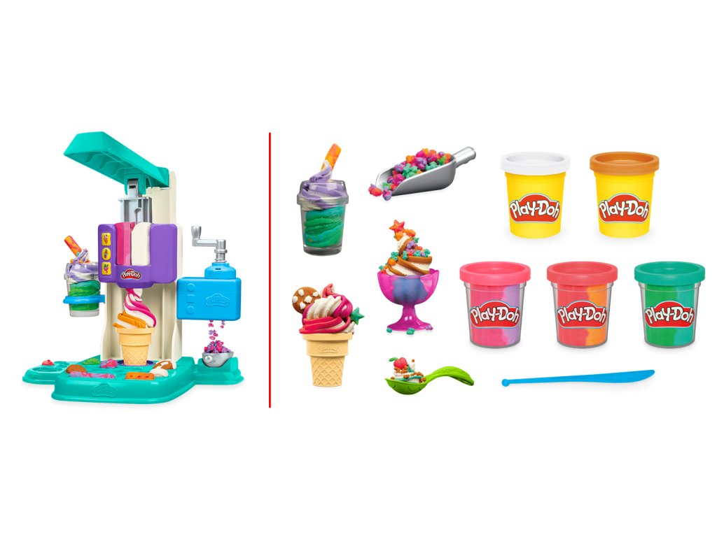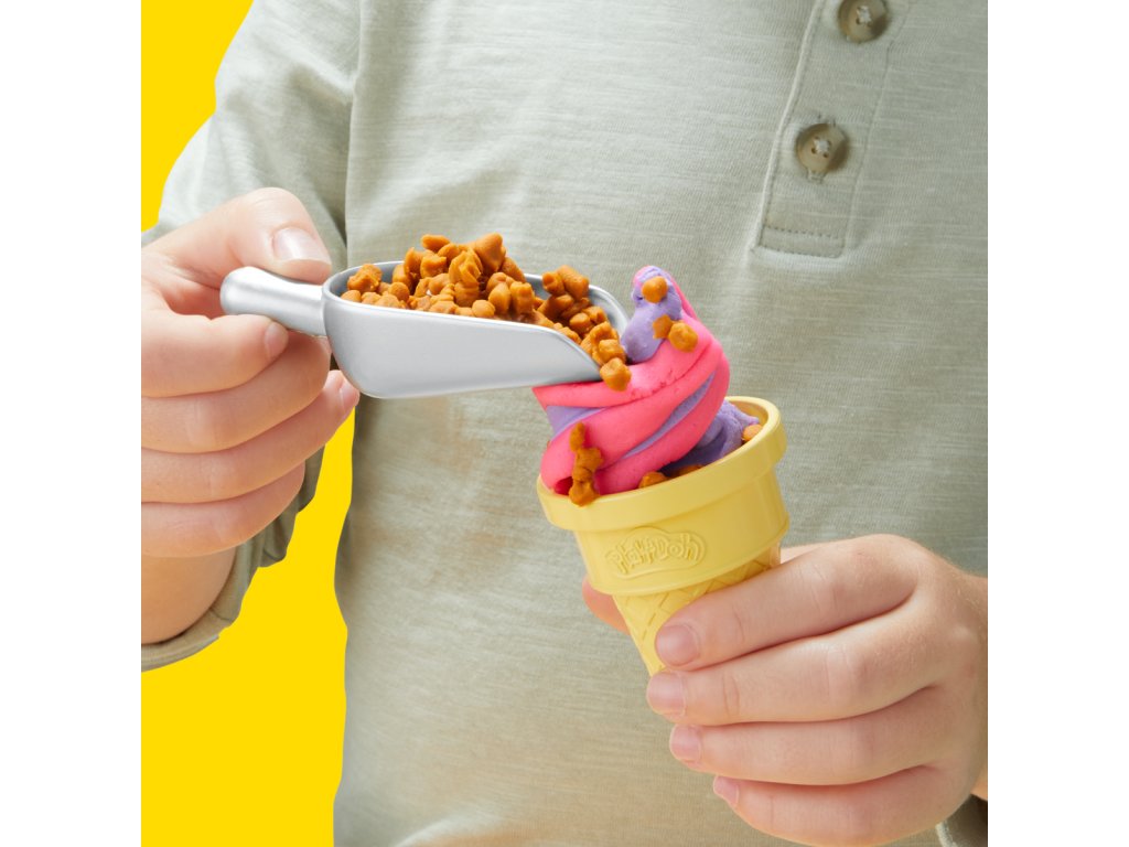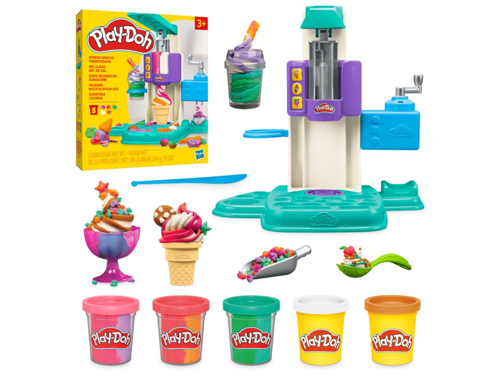 Vrhnete sa do nápaditej hry so sadou Play-Doh Rainbow Swirl Ice Cream! Vytvárajte najfarebnejšiu zmrzlinu z Play-Doh s unikátnym dúhovým okrajom. Vytvorte si vlastnú chuť s ľubovoľným farebným okrajom alebo ich premiešajte pre efekt dúhy. Vytvorte hviezdičky a bodky, ktoré môžete naliať do stroja alebo použiť ako dekoráciu. Otáčavá základňa na vytvorenie dokonalého farebného víru. Balenie obsahuje stroj na zmrzlinu, lyžicu, nôž, naberačku, misku, kornút a pohár s vekom. Súčasťou je tiež 5 pohárkov plastelíny, z toho tri dvojfarebné. Vhodné pre deti od 3 rokov.Dodatočné parametre