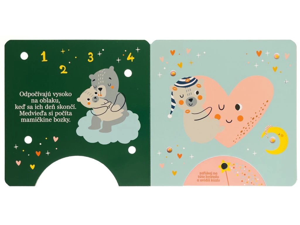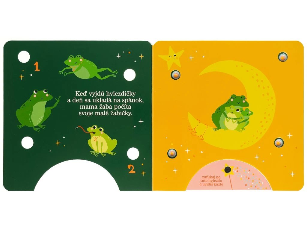 Počítam ovečky pred spanímKúzelný večerný rituál pre detiPočítam ovečky pred spaním – Interaktívne leporelo Fúkni a rozsvieť je pôvabná kniha pre najmenšie deti, ktorá spája zábavu, učenie a pokojný večerný rituál. Stačí jemne zafúkať na snímač v dolnej časti knihy a rozžiaria sa kúzelné svetielka, ktoré robia z čítania nezabudnuteľný zážitok. Deti spolu so žabičkami, sloníkom, medvedíkom a baránkom počítajú hviezdičky a ovečky až kým nezaspia. Veršované texty a milé ilustrácie podporujú predstavivosť a navodzujú pokojnú atmosféru pred spaním. Interaktívny princíp „fúkni a rozsvieť“ pomáha deťom uvoľniť sa, upokojiť a s úsmevom zaspávať. Ideálne pre rozvoj jemnej motoriky, počítania a zmyslového vnímania. Leporelo vytvára magický večerný rituál, ktorý posilňuje puto medzi rodičom a dieťaťom.