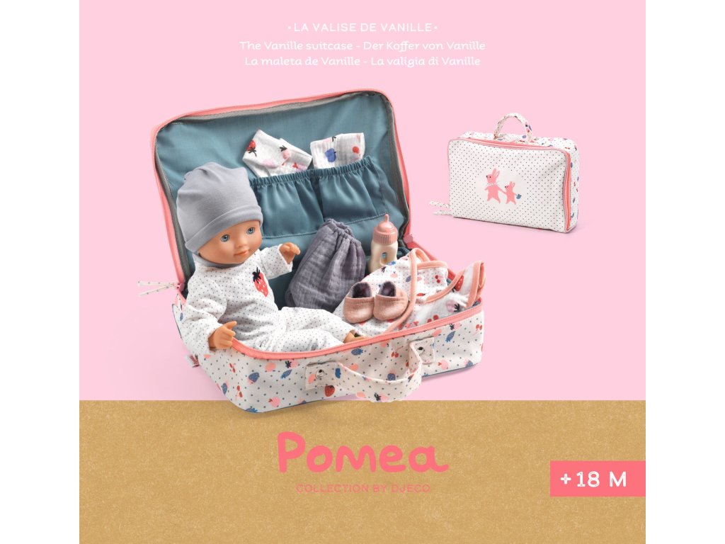 Pomea: Bábika Vanille a jej cestovný kufríkRoztomilá bábika s doplnkami na cestovanie a hraniePomea – bábika Vanille a jej cestovný kufrík je krásna a kvalitne spracovaná textilná bábika od značky Djeco, ktorá prináša množstvo zábavy a kreatívnych možností pre deti. Vanille má svoj cestovný kufrík plný drobných doplnkov, takže sa deti môžu hrať na cestovanie, výlety, pikniky či návštevy kamarátov. Bábika je primerane veľká pre detské ruky a jej jemné detaily podporujú rozvoj predstavivosti a starostlivosti.Prečo si vybrať hračku od Djecovhodná pre deti od 18 mesiacovmäkká textilná bábika s milým dizajnomobsahuje cestovný kufrík s doplnkamikvalitné spracovanie a bezpečné materiályObsah baleniabábika Vanillecestovný kufríkdoplnky do kufríka (oblečenie a malé hračkárske predmety)Dodatočné parametre