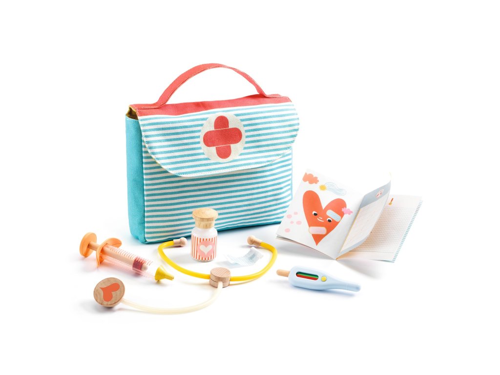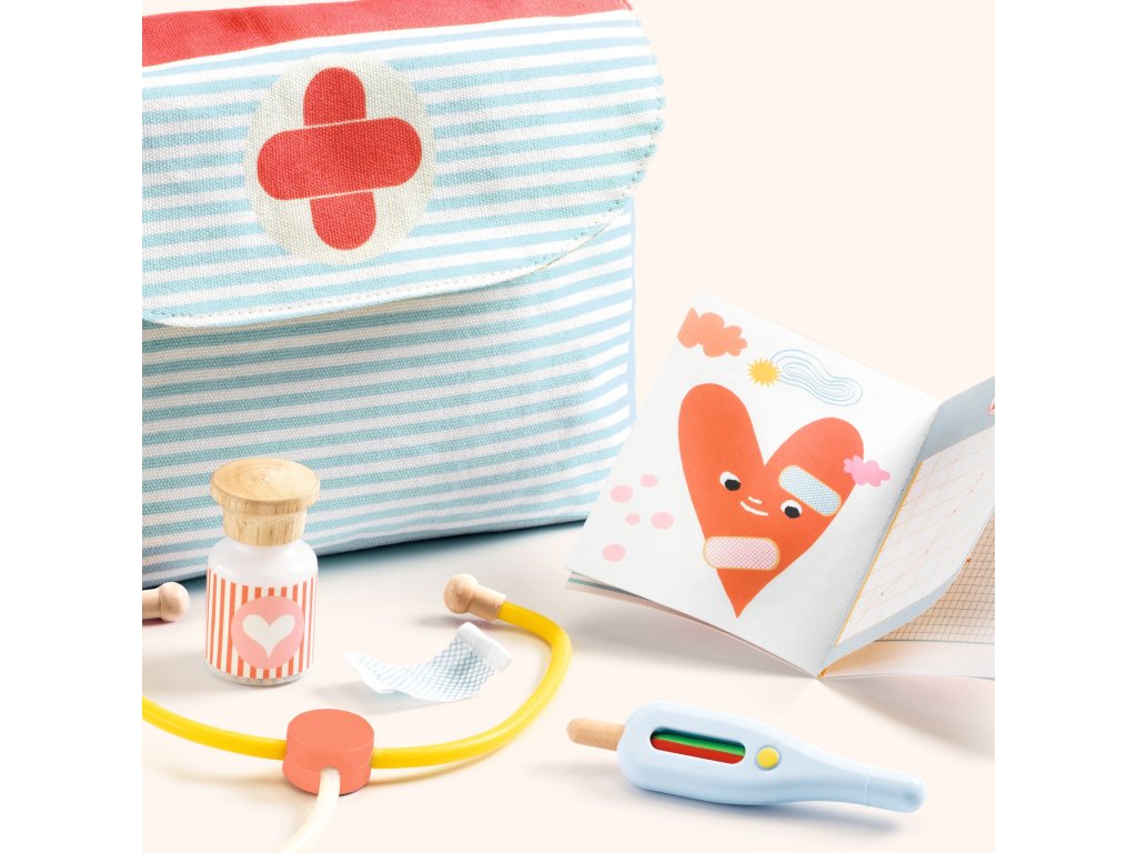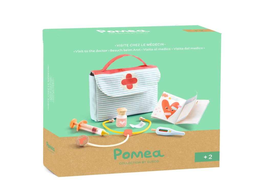 Pomea Lekárska taška pre bábiky Malý doktor v akcii: vypočuj srdiečko, zmeraj teplotu a ošetri bábiku kdekoľvekPomea Lekárska taška pre bábiky je rolová sada, s ktorou sa deti zahrajú na vyšetrenie a starostlivosť o „chorú“ bábiku.V prenosnej taške s držadlom nájdu najdôležitejšie pomôcky: teplomer, stetoskop, striekačku, fľaštičku s „medicínou“, obväz a zdravotnú knižku.Teplomer je spracovaný hravo – zelená znamená „zdravý“, červená „horúčka“.Rýchly prehľad odporúčaný vek: od 2 rokov rozvíja: empatiu, komunikáciu, rolovú hru, jemnú motoriku v balení: taška a 6 doplnkov na „vyšetrenie“Prečo si ju deti zamilujú všetko je v taške – doktor ide na návštevu aj do inej izby realistické prvky motivujú k hre: stetoskop, teplomer, striekačka učí deti jemnosti a starostlivosti: ošetrenie bez strachu zdravotná knižka podporí vymýšľanie príbehov a „diagnóz“Ako sa s tým hrá Otvor tašku a priprav pomôcky na „ordináciu“. Zmeraj bábike teplotu a vypočuj jej srdiečko stetoskopom. Podaj „liek“, použi „injekciu“ a na záver prilož obväz.Obsah balenia 1× prenosná taška 1× teplomer 1× stetoskop 1× striekačka 1× fľaštička s „medicínou“ 1× náplasť 1× zdravotná knižkaTechnické parametre materiál: textil (taška), drevo (FSC), plast, papier/kartón rozmery balenia: približne 22 × 22 × 4 cmDodatočné parametre