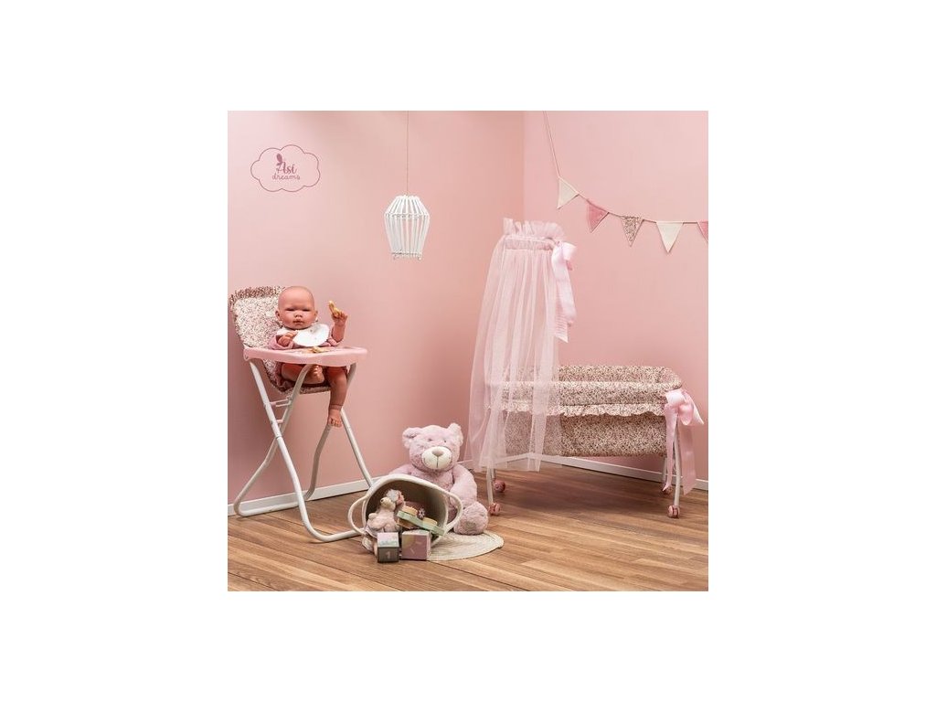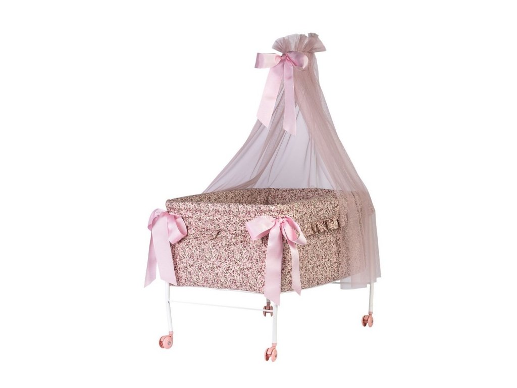Posteľ pre bábiku na ružových kolieskach má skladací, ľahký, kovový, bielo lakovaný rám. Vanička je vyrobená z kvalitnej béžovej bavlny s malými ružovými kvietkami. Volániková úprava, vzdušný ružový tyl zavesený na úzkej kovovej konštrukcii a lesklé saténové mašle dodávajú celej veci luxusný vzhľad.