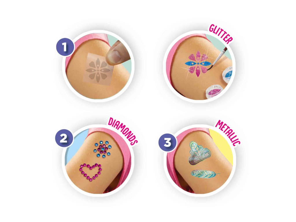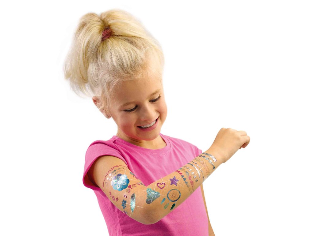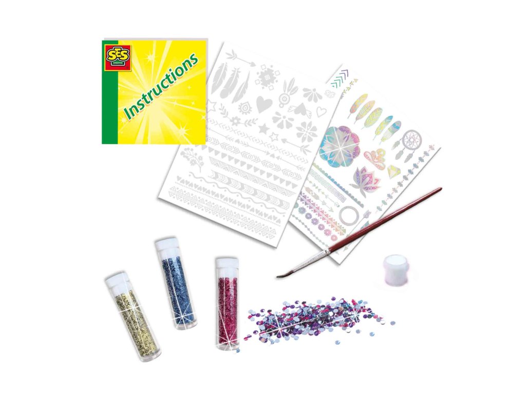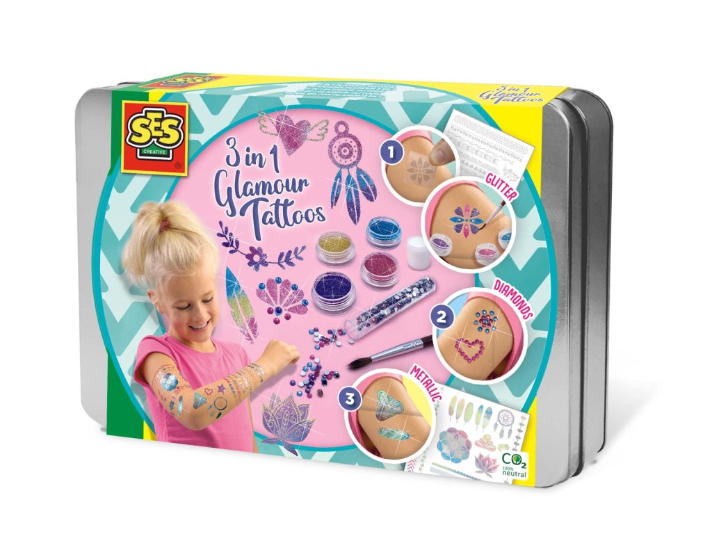 Tato luxusní kosmetická sada 3 v 1 od společnosti SES Creative vám umožní ozdobit se tím nejkrásnějším módním tetováním. Tato sada obsahuje nádherné metalické tetování, průhledné samolepky na tetování, které si můžete sami posypat různými pestrobarevnými třpytkami, a speciální lepidlo na pokožku. Pomocí lepidla si na kůži napište své jméno nebo si vytvořte vlastní kresbu a poté ji posypte třpytkami nebo nalepte luxusní diamanty. Během chvilky budete vypadat opravdu slavnostně! Kosmeticky testováno a snadno omyvatelné z pokožky. Obsahuje: metalické tetování, tetování se práškovými třpytkami, 4 barvy třpytek, štětec, lepidlo na kůži, diamantové kamínky, návod a luxusní dóza na skladování. Rozměry balení: 19,8 x 29,8 x 3,8 cm. Věk: 5+Dodatočné parametre