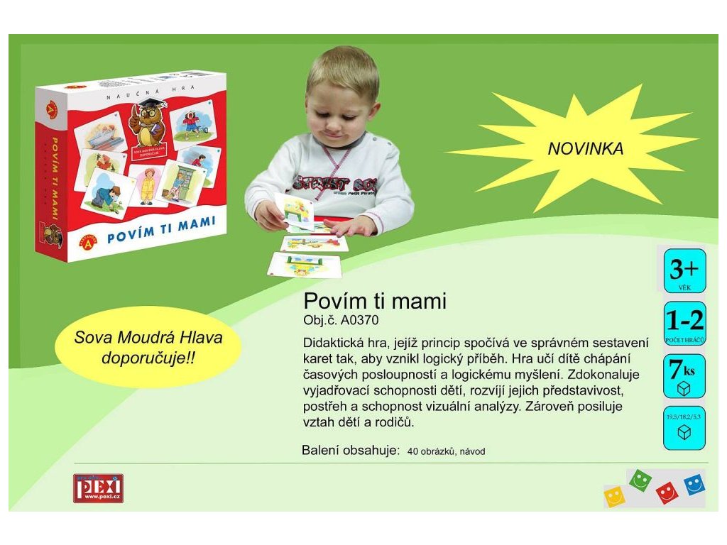 Didaktická hra pre deti od 3 rokov, ktorá učí chápať zábavnou formou časovú postupnosť a rozvíja vyjadrovacie schopnosti detí. Rozprávajte sa s deťmi pomocou obrázkov. Hra Poviem Ti, mami vyhrala 2. miesto "Hračka roku 2016" v kategórii Vzdelávacie a kreatívne hračky.Dodatočné parametre