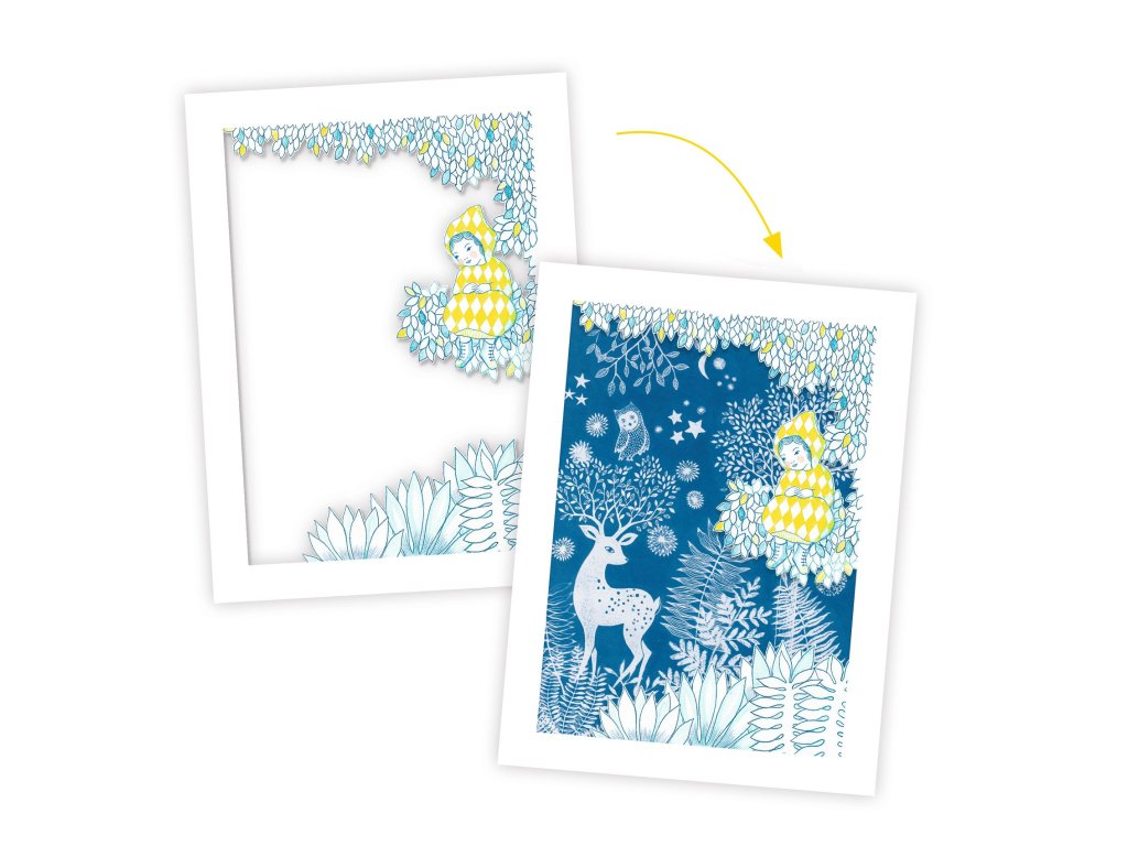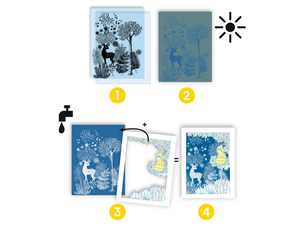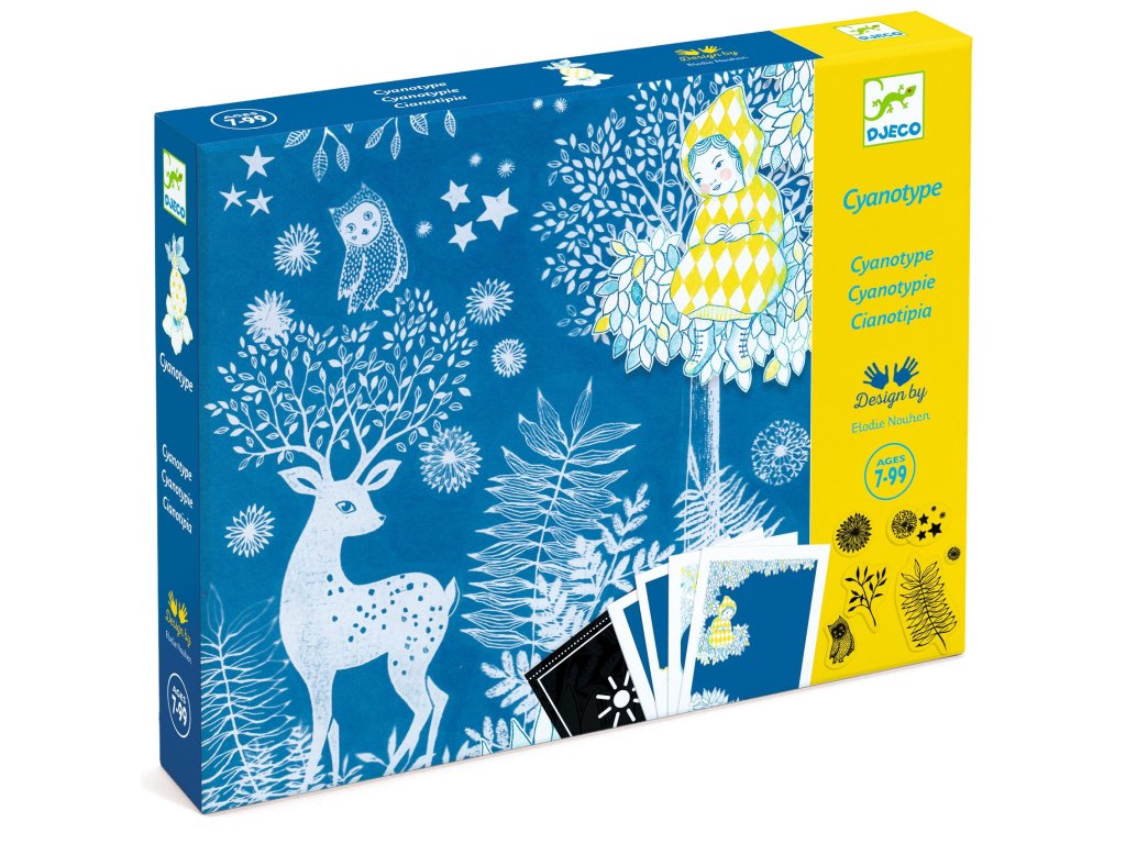 Pri mesačnom svite: Kyanotypová (fotocitlivá) sadaKreatívna sada pre deti – vytváraj modré fotografie ako v starých časochPri mesačnom svite – kyanotypová (fotocitlivá) sada je unikátna kreatívna sada, ktorá deťom umožní objaviť základy alternatívnej fotografie – kyanotypie. Pomocou svetlocitlivého papiera, prírodných objektov (napr. listy, kvety) alebo vlastných šablón môžu deti vytvárať originálne modré obrázky. Aktivácia papiera prebieha pôsobením svetla – tradične slnečného alebo umelého. Potom stačí papier opláchnuť čistou vodou. Obrázok sa objaví na modrom pozadí.Prečo si vybrať túto kreatívnu sadu od Djecovhodná pre deti od 7 rokovoriginálna tvorivá aktivita s prvkami fotografieučí deti o svetle, tieňoch a chemických reakciáchvýsledné obrazy sú krásne a jedinečnéideálna aktivita na doma aj do školyObsah balenia4 laserom vyrezané rámy8 hárkov fotocitlivého papiera (21 × 28 cm)85 vzorov vytlačených na acetáteplexisklohárok obojstranných nálepiekDodatočné parametre