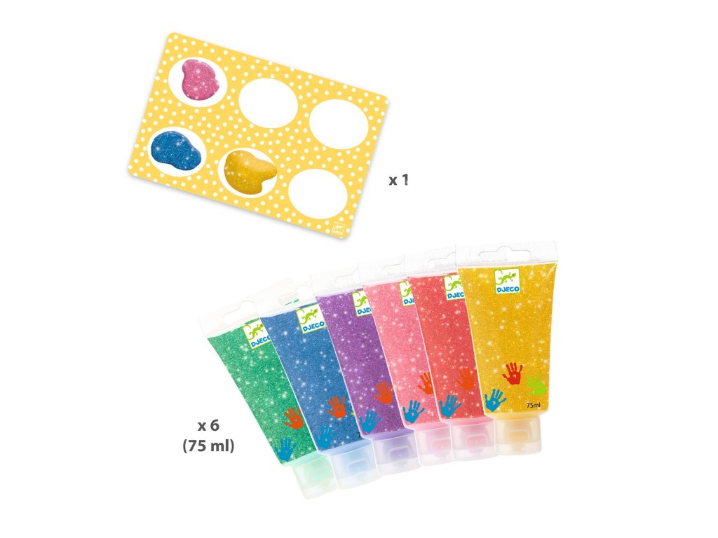 Prstové farby v tube – trblietkové (6 ks)Sada 6 trblietavých farieb na prsty pre najmenších – tvorenie, zábava a prvé umelecké výtvoryKreatívna sada trblietavých prstových farieb v tube od značky Djeco prináša deťom bezpečnú a zábavnú cestu k prvému maľovaniu. Farby sú ľahko vytláčateľné priamo z tuby, takže deti môžu bez pomocníka rovno tvoriť, experimentovať s farbami a vytvárať prvé umelecké diela prstami alebo štetcom. Trblietavé odtiene zaisťujú pri každom dotyku žiarivý efekt. Tieto prstové farby sú navrhnuté pre malé detské ruky a ideálne na kreatívnu hru doma či v škôlke. Sú netoxické, zmyteľné a prateľné, takže rodičia sa nemusia obávať trvalých škvŕn na oblečení alebo na pokožke. Súčasťou balenia je praktická paletka na farby, ktorá podporuje čistú a pohodlnú tvorbu bez zmiešania farieb.Deti môžu:Maľovať priamo prstamiPoužívať trblietavé farby na papier, kartón alebo plátnoKombinovať odtienePrecvičiť jemnú motoriku a farebné vnímanieObsah balenia:6 veľkých tub trblietavých prstových farieb (6 × 75 ml): ružová, zlatá, modrá, zelená, fialová, červenáPlastová paletka na farbyČo deti pri tvorení rozvíjajú:Jemnú motoriku a koordináciu oko–ruka pri aplikovaní fariebKreativitu a predstavivosť pri maľovaní vlastných obrázkovPrečo si vybrať tieto trblietavé prstové farby:Farby sú ľahko umývateľné vodou – nezanechávajú trvalo škvrny na oblečení či pokožkeTrblietavé odtiene sú vizuálne pútavé a motivujú deti k tvorbePraktické tuby umožňujú presné dávkovanie farby priamo na paletuIdeálne prvé farby pre maličkých tvorcov už od 18 mesiacovKvalitné a bezpečné materiály podľa európskych bezpečnostných noriemSada trblietavých prstových farieb je ideálnym nástrojom na podporu kreativity a rozvoja detí v ranom veku. Zábavná a jednoduchá cesta k prvým umeleckým skúsenostiam!Dodatočné parametre