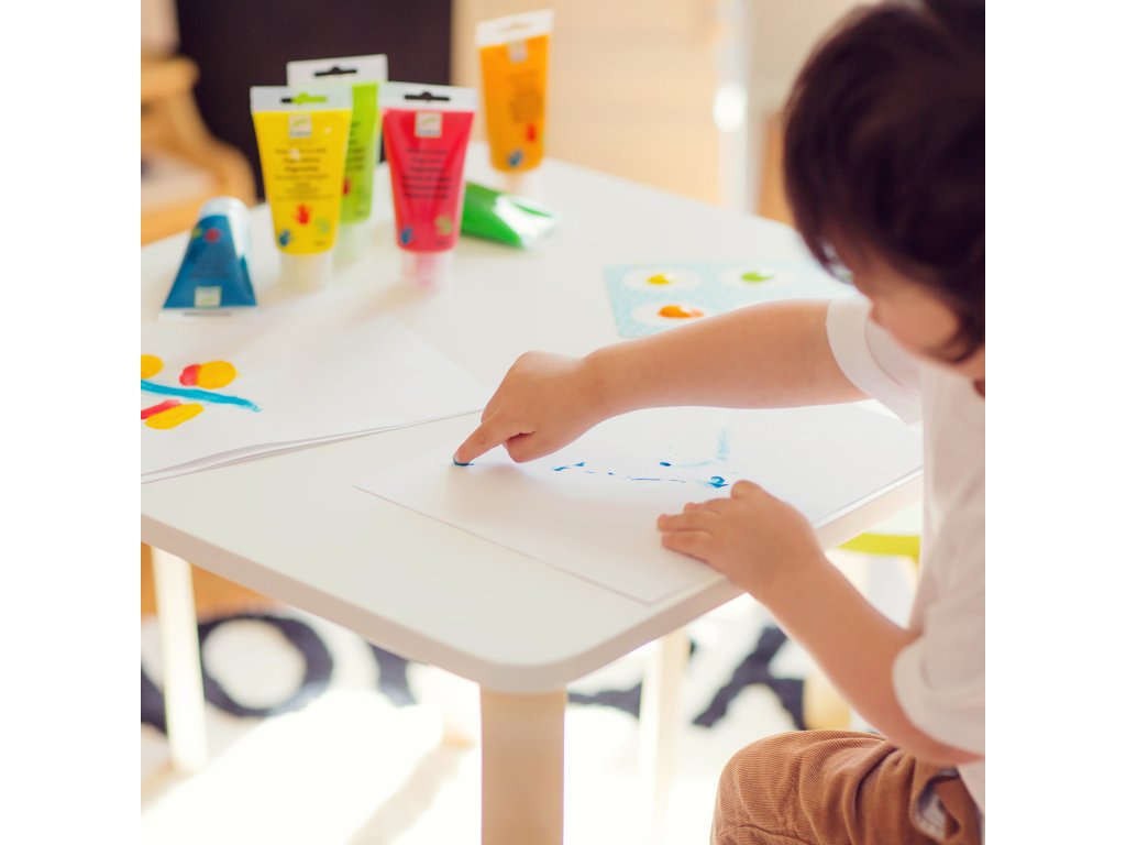 Prstové farby v tube – veselé (6 ks)Kreatívne prstové farby pre deti – 6 veselých odtieňov na maľovanie a tvorenieKreatívna sada prstových farieb v tubách – 6 ks od značky Djeco je ideálnym riešením pre prvé umelecké pokusy detí. Tieto farby sú navrhnuté tak, aby sa ľahko nanášali prstami, čo podporuje sebavedomé tvorenie bez potreby štetcov či komplikovaných pomôcok. Farby sa dajú použiť na papier, kartón alebo iné kreatívne materiály, takže deti môžu bez obmedzení experimentovať s formou, farbou a textúrou. Farby sa bez problémov umývajú z pokožky a textilu, sú netoxické a bezpečné pre deti. Vďaka pohodlným tubám ich deti samostatne dávkujú priamo na paletu alebo papier.Deti môžu pomocou tejto sady:Maľovať priamo prstami, čím rozvíjajú hmatové vnímanieMaľovať rôzne tvary, vzory a abstraktné obrázkyKombinovať farby a skúšať nové odtieneTvoriť koláže a maľby podľa vlastnej fantázieObsah balenia:6 tub prstových farieb (6 x 75 ml): červená, žltá, modrá, zelená, oranžová, jarná zelenáPlastová paletka na farbyKaždá tubička obsahuje dostatočné množstvo farby, ktoré vystačí na viacero kreatívnych výtvorov.Čo deti pri tvorení rozvíjajú:Jemnú motoriku a koordináciu oko–ruka, keď deti farbu nanášajú priamo prstamiKreativitu a predstavivosť, keď kombinujú farby a tvaryPozornosť pri vizuálnej tvorbe a experimentovaníPrečo si vybrať tieto prstové farby:Bezpečné a netoxické – vhodné pre deti už od ~2 rokovĽahko sa umývajú vodou z pokožky aj oblečeniaPohodlné tuby umožňujú presné dávkovanie farbyIdeálne pre domáce tvorenie, škôlky aj výtvarné dielnePodporujú prvú vizuálnu expresiu a tvorivé myslenieKvalitné farby značky Djeco, ktorá dbá na detskú bezpečnosťTieto prstové farby sú skvelým spôsobom, ako rozvíjať kreatívne zručnosti a predstavivosť detí. Poskytnú im hodiny zábavy a prvé umelecké zážitky!Dodatočné parametre
