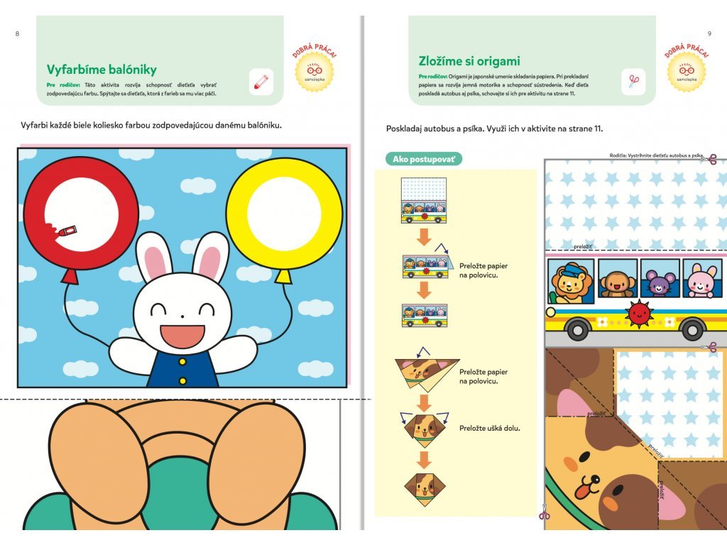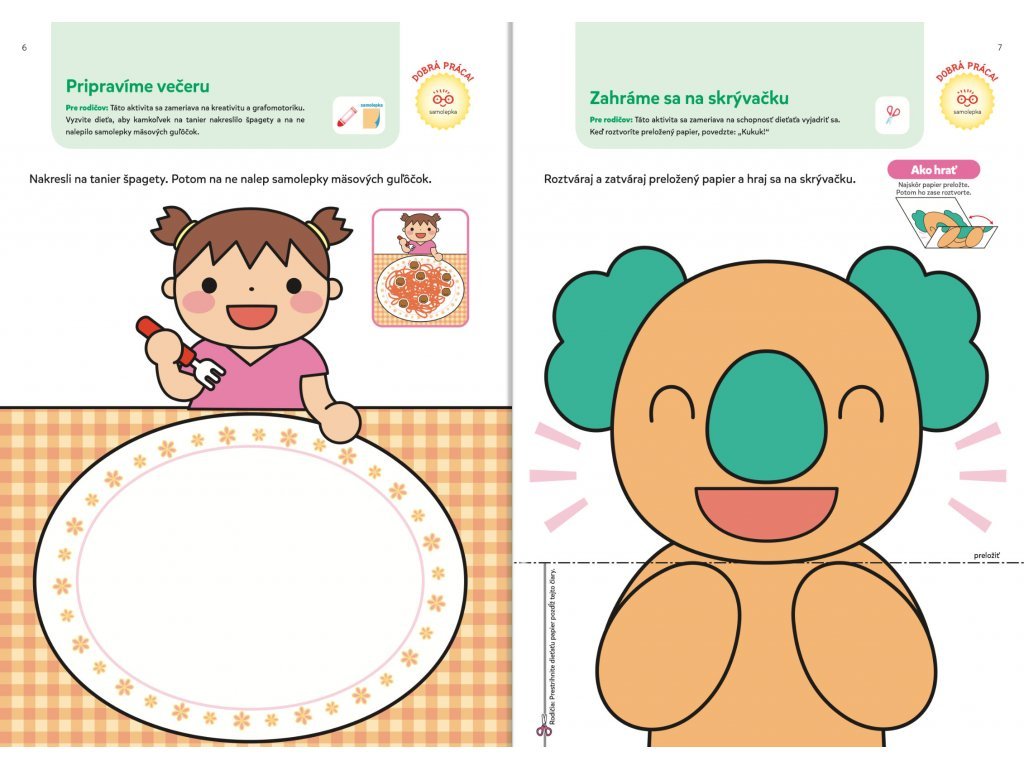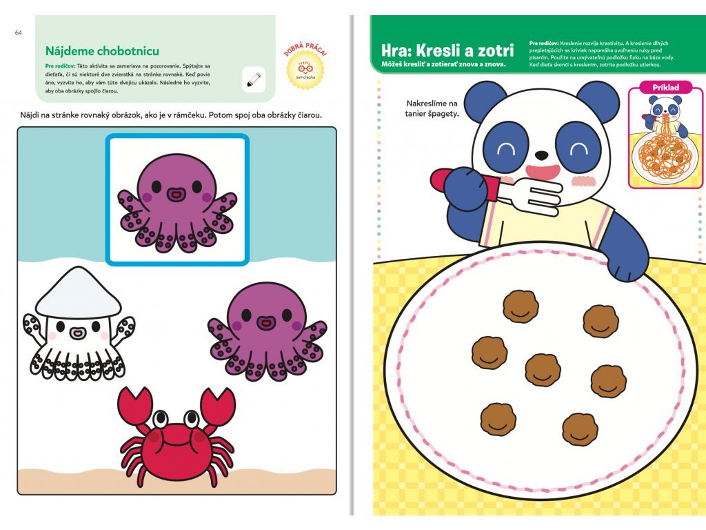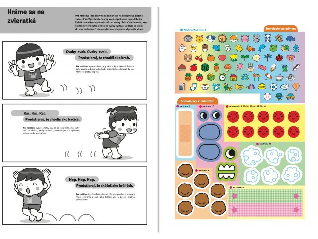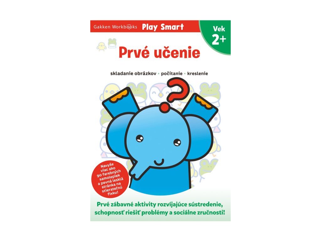Prvé učenie 2+ Ideálny pracovný zošit pre detské ručičky! Je určený deťom od dvoch rokov, ktoré sa ešte len začínajú učiť. Kniha svojím vyhotovením zodpovedá vývojovej fáze dieťaťa, zraku aj veľkosti jeho ruky. Obsahuje viac ako 90 farebných samolepiek určených na používanie pod dohľadom rodičov. Niektoré dieťa použije v rámci úloh a ostatné samolepky zvierat, zeleniny, ovocia, hračiek a ďalších vecí, ktoré sú preňho známe a ľahko rozpoznateľné, slúžia ako samolepky za odmenu. Zošit sa začína jednoduchšími aktivitami. Aktivity postupne predstavujú čoraz väčšie výzvy.Viac ako 90 samolepiek, pútavé aktivity a rozvoj zručností prostredníctvom hier a zábavných úloh. Pri plnení úloh dieťa používa lepidlo, ceruzku a voskovky na rozvoj zručností predškolskej prípravy. Keď dieťa splní aktivity, môže si za odmenu vybrať samolepku, ktorú si nalepí na danú stránku. V priebehu knihy sa úroveň obťažnosti zvyšuje. Táto metóda "krok za krokom" pomáha deťom rozvíjať jemnú motoriku, koncentráciu a kritické myslenie.Dodatočné parametre