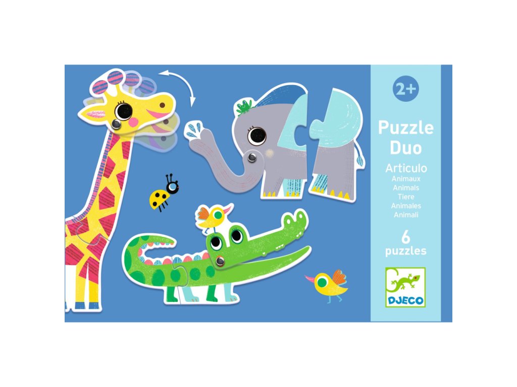 Puzzle duo pohyblivé Zvieratká 6 ks Rozvíjanie zručností u najmenších s veselými zvieratkami Edukačné puzzle pre batoľatá sú skvelým spôsobom, ako zabaviť a zároveň rozvíjať zručnosti malých detí. Puzzle obsahuje farebné siluetové zvieratká s pohyblivými časťami – môžete pohybovať rukou opice, hlavou leva alebo chvostom páva. Táto interaktívna hračka podporuje pozorovaciu schopnosť a sústredenosť, a vďaka veľkým a odolným dielom vydrží dlhé hodiny hrania. Puzzle je zabalené v pevnej škatuli s ilustráciami a praktickým povrázkom na jednoduché prenášanie. Vyrobené z lepenky a papiera s ekologickým certifikátom FSC®, ideálne pre deti od 2 rokov.Dodatočné parametre