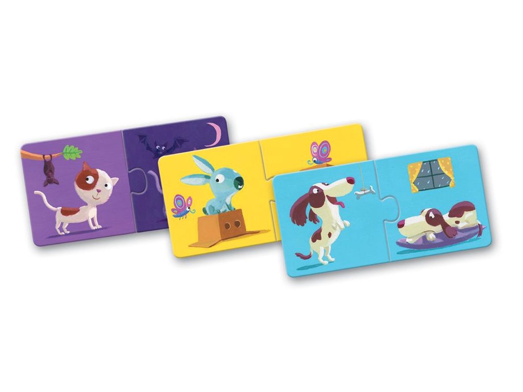 Puzzle duo Protiklady Nauč sa rozoznávať protiklady. Krásne ilustrované puzzle bude deti zoznamovať s protikladmi. Balenie obsahuje 24 dielikov puzzle, z ktorých vytvoríte 12 puzzle obrázkov zobrazujúcich zvieratko v dvoch protichodných situáciách. Dieťa si bude rozširovať slovnú zásobu zatiaľ čo ho budú milé zvieratká zabávať. Nádherne ilustrované dvojdielne puzzle naučí pomenovávať protiklady. Puzzle pre rozvoj kreativity sú obľúbenou zábavou detí, ktorá rozvíja logické myslenie, pamäť a predstavivosť. Zároveň si skladaním precvičujú jemnú motoriku.Dodatočné parametre