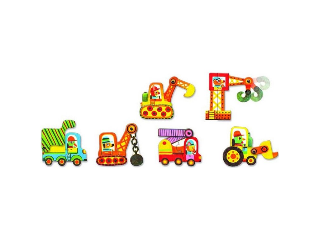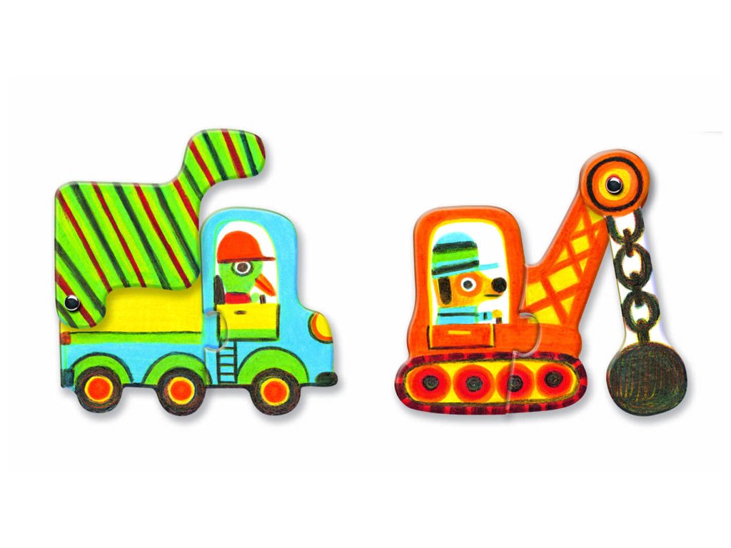 Puzzle duo Vozidlá Veselé auto, nakladač, žeriav, bager a iné.. Každý dopravný prostriedok sa skladá z 2 častí puzzle. Pre deti od 2 rokov. Balenie obsahuje 6 x 2 kusy puzzle.Materiál: pevný, vytvrdený kartónRozmer balenia: 18 x 12 x 6 cmDodatočné parametre