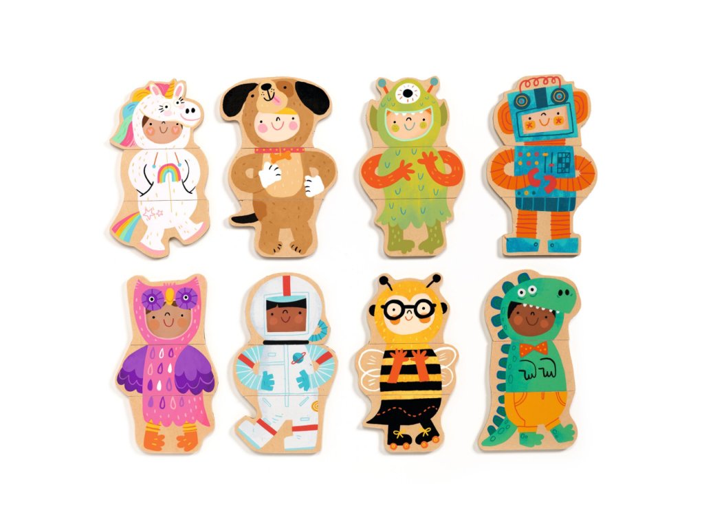 Puzzle magnetky Kostýmy Pomôžte nájsť sove krídla! Sada 24 drevených magnetiek na poskladanie 8 postavičiek veselých detí v kostýmoch. Každá postavička sa skladá z hlavy, trupu a nôh. Postavičky sú veľmi živo ilustrované - vymyslite si o nich kratučké príbehy! Magnetky sú vhodné na magnetickú tabuľu, ale aj na chladničku. Balené sú v peknej pevnej škatuli s magnetickým uzáverom, ktorá poslúži na uskladnenie magnetiek. Drevená edukatívna hračka na princípe voľného kombinovania dielov. Dieťa môže experimentovať s farbami a tvarmi.Obsah: 24 drevených magnetiekOdporúčaný vek: 2+ rokovRozmery balenia: 22 x 19 x 4 cmDodatočné parametre