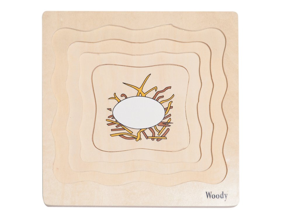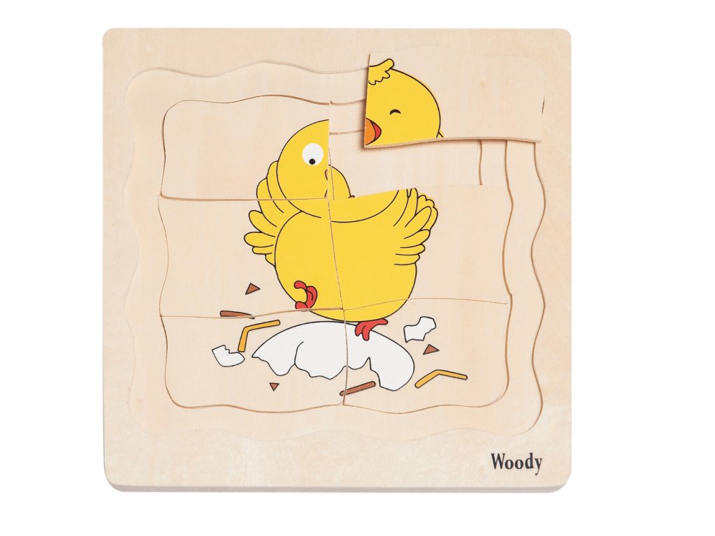 Vek: 3+. Rozmery: 18x19x1,5cm. Drevené viacvrstvové puzzle. Jednotlivé časti je potrebné skladať tak, aby vytvorili dno pre ďalšiu vrstvu. Obrázky zobrazujú vývoj sliepky od vajíčka až po dospelú sliepku. Video: https://www.youtube.com/watch?v=QTgQKRRq10cDodatočné parametre
