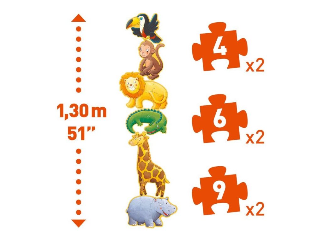 Puzzle so zvieratkami pre všetkých milovníkov safari. Nádherné progresívne puzzle s milými zvieratkami, aj pre malé deti, nakoľko pozostávajú z dostatočne veľkých dielikov.Rozvíja logické myslenie a jemnú motoriku. Puzzle, ktoré rozvíja u detí jemnú motoriku, zručnosť, logické myslenie, predstavivosť a je vhodné aj na pomenovávanie zvieratiek. Jednotlivé zvieratká sa skladajú z 4, 6, 9 dielikov. Deti môžu na začiatok skladať obrázok s menším počtom dielikov, kým postupne prejdú na väčší obrázok. Rozmer balenia: 33 x 25,5 x 6 cm.Dodatočné parametre