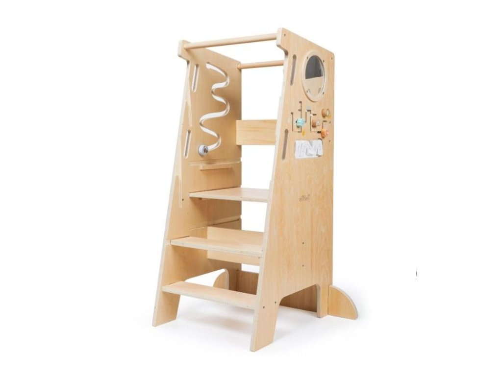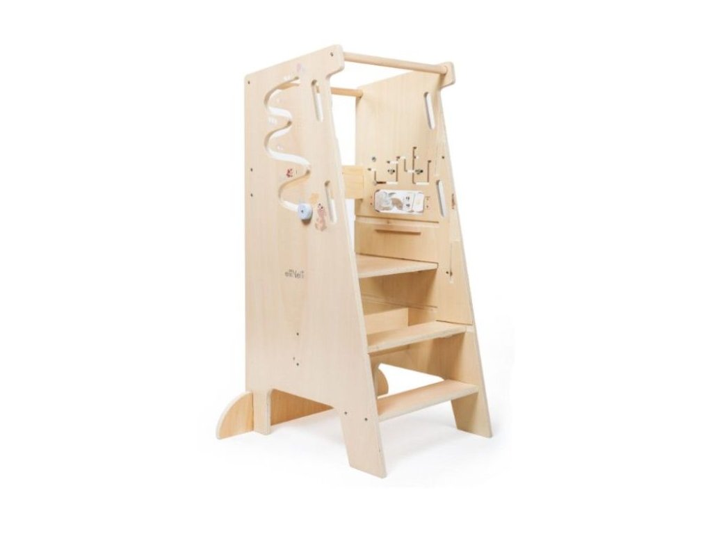 Multifunkčná učiaca veža pre deti s motívmi zvieratiek Multifunkčná a zároveň rastúca učiaca veža 5v1 so stabilizačnými nožičkami je detským nábytkom, ktorý pomôže deťom bezpečne vystúpiť do potrebnej výšky, pozorovať, objavovať, zdokonaľovať svoje schopnosti, učiť sa aj originálnou hračkou pre deti. Rastúca učiaca veža 5v1 - schodíky + učiaca veža + set detského nábytku (stolček + stolička) + hračka (celkom 4 hracie prvky). S nastaviteľnou plošinou do 3 úrovní (30, 40 alebo 50 cm), sa výškovo prispôsobí každému dieťatku od 1 do cca 6 rokov. Vďaka učiacej veži sa deti stanú súčasťou kuchynských prác, môžu pridať ruku k dielu pri varení, príprave jedla alebo majstrovaní, môžu tráviť viac času s rodičmi. Učiaca veža pre deti skvele poslúži nielen v kuchyni, ale aj v detskej izbe alebo kúpeľni, kde vedie deti k samostatnosti. Tento všestranný pomocník sa jednoducho premení na detský stolček so stoličkou, u ktorého môžu deti tvoriť aj desiatovať. Stačí rastúcu učiacu vežu položiť zadnou stranou na podlahu a presunúť plošinu, na ktorej deti v učiacej veži stoja. Plošina poslúži ako doska stola. Obidve bočnice učiacej veže, so svojimi 4 hracími prvkami, prinášajú deťom zábavu aj možnosť vzdelávania. Na jednej strane deti nájdu parádnu guľôčkovú dráhu, na druhej strane potom zrkadlo, bludisko aj otočné doštičky s číslicami. Učiaca veža prešla vylepšením v oblasti bezpečnosti: stabilizačné nožičky pre väčšiu stabilitu, podporné doštičky pod plošinou zvyšujú nosnosť plošiny a zamedzujú jej prepadnutiu, plná spodná časť bočníc neumožní deťom šplhať sa po bočných stranách, bezpečnostnú zábranu môžete zaistiť, aby si ju dieťa samé nezložilo, stolček v prípade použitia ako setu nábytku môžete zaistiť kolíčkom. Nie ste si istí tým, ktorá z našich učiacich veží je pre vaše dieťa najvhodnejšia? Pripravili sme pre vás radcu Ako vybrať učiacu vežu? alebo vám s výberom pomôže naše video nižšie. Prečo kúpiť túto rastúcu učiacu vežu: Kvalitná výroba - multifunkčná učiaca veža je vyrobená z kvalitnej preglejky, s hrúbkou 15 mm. Montessori pedagogika - počítadlo rešpektuje princípy Montessori pedagogiky, podporuje prirodzený rozvoj dieťaťa a je v súlade s jeho potrebami. Vylepšená + bezpečnejšia - multifunkčná učiaca veža prešla vylepšením najmä v oblasti bezpečnosti, boli doplnené bezpečnostné prvky a vychytávky, vďaka ktorým je učiaca veža bezpečnejšia. Nové bezpečnostné prvky - stabilizačné nožičky, podporné doštičky pod plošinou, možnosť zaistenia bezpečnostnej zábrany aj stolčeka. Multifunkčná (5v1) - učiaca veža, schodíky, set detského nábytku (stolička so stolčekom), hračka (zrkadlo, bludisko, otočné prvky, guľôčková dráha). Set detského nábytku (stolček + stolička) - stačí učiacu vežu položiť zadnou stranou na podlahu a razom sa premení na praktický set detského nábytku. Presunutím plošiny, na ktorej vaše dieťatko v učiacej veži stojí, vytvoríte stolček, kde deti môžu desiatovať, vyrábať a tvoriť. Hračka - každá z bočníc učiacej veže obsahuje iné hracie prvky a prináša deťom zábavu, možnosť zdokonaľovať svoje schopnosti a vzdelávať sa. Rastúca - učiaca veža porastie s vašim dieťaťom. Výšku plošiny môžete výškovo nastaviť do 3 úrovní (30, 40 alebo 50 cm) a vežu tak prispôsobiť každému dieťaťu, od 1 roka až do cca 6 rokov. Stabilná a bezpečná - vďaka kvalitnému materiálu, pevnej konštrukcii a bezpečnostným prvkom je učiaca veža stabilná, vysoké bočnice, zadné a predné zábrany ochránia dieťa pred prípadným pádom. Na náter sa používajú vodou riediteľné laky. Praktický pomocník a hračka do domácnosti - učiaca veža pomôže deťom vyrásť a stať sa súčasťou každodenných činností nielen v kuchyni, svojimi hracími prvkami (guľôčková dráha, zrkadlo, bludisko, otočné prvky) prináša deťom zábavu a po položení sa premení na set detského nábytku. Učí a pomáha - rastúca učiaca veža pomôže deťom vyrásť, stať sa súčasťou každodenných činností, učiť sa od svojich rodičov, pozorovať ich, skúšať, objavovať a učiť sa. Deti zdokonaľujú motorické schopnosti, manuálnu zručnosť, logické myslenie, rozvíjajú kreativitu a fantáziu, posilňujú sociálne väzby. Učiaca veža navyše učí deti samostatnosti - podať si obľúbenú hračku, napustiť si vodu, umyť si ovocie, podať si kefku na zúbky. Ako set detského nábytku podporuje učiaca veža kreativitu, fantáziu, jemnú motoriku a manuálnu zručnosť pri hre s hračkami, kreslení a maľovaní, pri tvorení. Hracie prvky zdokonaľujú jemnú motoriku, manuálnu zručnosť, logické myslenie, koordináciu očí a rúk. Zvieratká - vďaka hracím prvkom s motívom zvieratiek a prírody si učiacu vežu zamilujú dievčatká aj chlapci. Neutrálne farebné prevedenie - učiaca veža vyrobená z preglejky, ošetrená vodou riediteľným lakom, je praktickým pomocníkom aj krásnym kúskom detského nábytku do domácnosti. Technické parametre: Rozmery učiacej veže: 89,5 x 45,7 x 59 cm (výška v najvyššej časti x šírka x hĺbka v najhlbšej časti). Materiál: preglejka (hrúbka 15 mm), ošetrená transparentným, vodou riediteľným lakom. Hmotnosť: cca 6,9 kg. Nosnosť: 50 kg. Odporúčaný vek: od 1 roka, 12m+. Upozornenie: Učiaca veža je vyrobená z prírodného materiálu, na hranách sa striedajú tmavé a svetlé odtiene. Video a niektoré detailné fotografie sú ilustračné, teraz je učiaca veža ešte viac vylepšená. Značka eliNeli je česká značka drevených hračiek a nábytku s jedinečným farebným dizajnom a so zahraničnou výrobou. Produkty eliNeli rozvíjajú kreativitu a pohybový