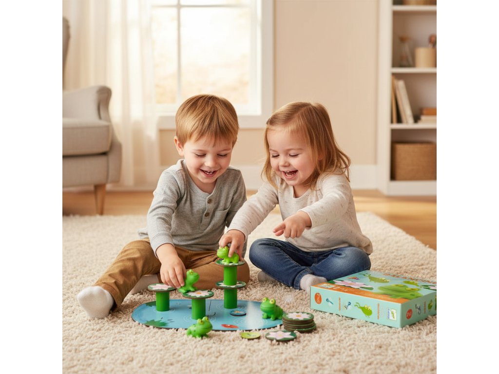 Rovnováha pre najmenších Žabky na leknách Rovnováha pre najmenších – Žabky na leknáchZábavná balančná hra pre malé detské rukyŽabky na leknách sú hravá balančná hra pre najmenších, ktorá deti učí pracovať s rovnováhou a stabilitou úplne prirodzeným spôsobom. Úlohou dieťaťa je ukladať žabky na lekná tak, aby sa konštrukcia neprevrátila.Hra je navrhnutá pre malé deti – má jednoduché pravidlá, veľké dieliky a krátky herný čas. Pri hre si deti trénujú jemnú motoriku, koordináciu oko–ruka a prvé pochopenie príčiny a následku.Pre koho je vhodná: odporúčaný vek: od dva a pol roka pre deti, ktoré rady skladajú, ukladajú a balansujú predmety ideálna ako prvá hra na rozvoj rovnováhy vhodná na samostatnú hru aj hru s rodičomHlavné benefity jednoduchá balančná mechanika prispôsobená najmenším rozvíja jemnú motoriku a stabilitu pohybov podporuje sústredenie a trpezlivosť učí deti odhadovať váhu a rovnováhu milá žabacia tematika, ktorá deti motivuje k hreObsah balenia lekná (balančné podložky) figúrky žabiekDodatočné parametre