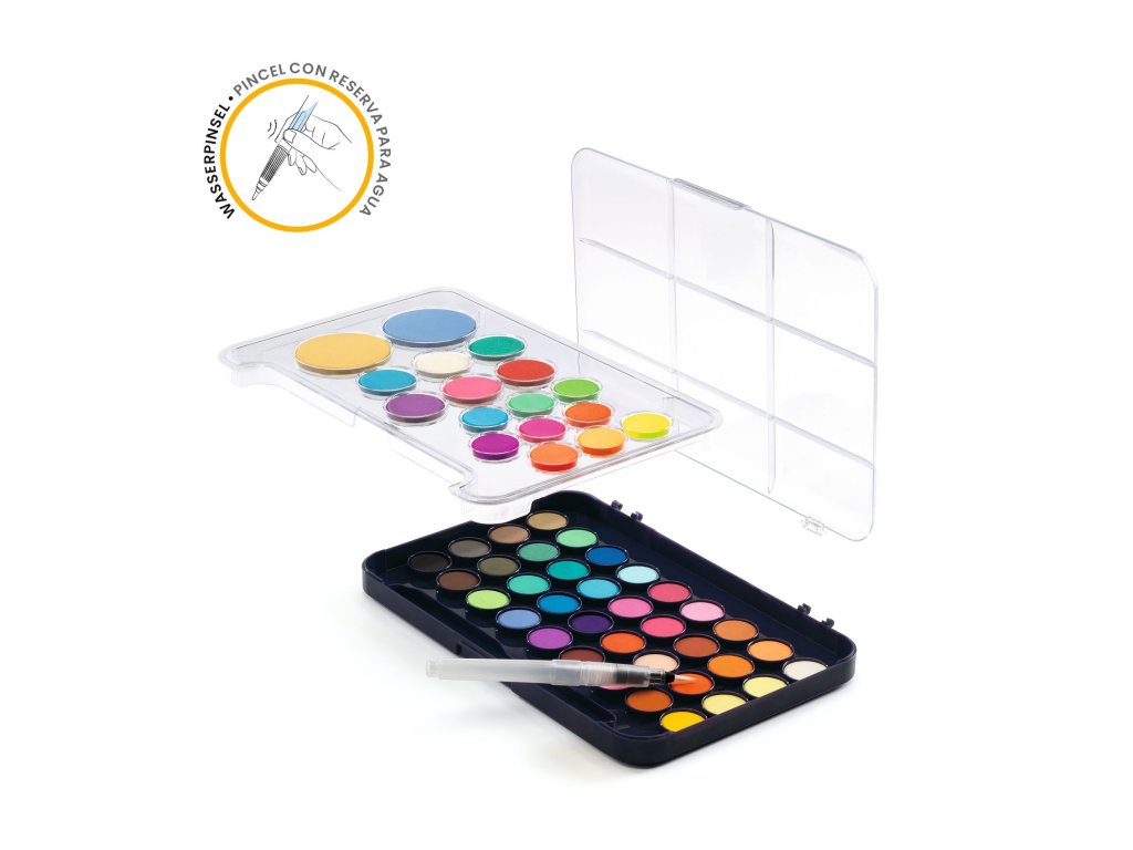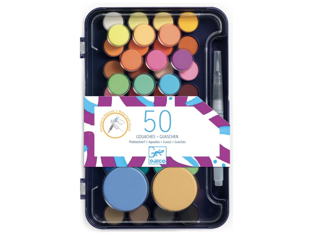 Sada 50 vodových farieb so štetcom a zásobníkom na voduKompletná výtvarná sada pre detiPraktická sada vodových farieb pre deti, ktorá obsahuje až 50 farebných odtieňov:36 štandardných farieb8 neónových farieb9 trblietavých fariebSúčasťou sady je aj štetec so zásobníkom na vodu, ktorý uľahčuje maľovanie a umožňuje deťom jednoducho tvoriť farebné obrázky.Prečo si vybrať túto sadu od Djecovhodná pre deti od 6 rokov50 pestrých farieb v jednej sadeštetec so zásobníkom na vodujednoduché a zábavné maľovanieDodatočné parametre