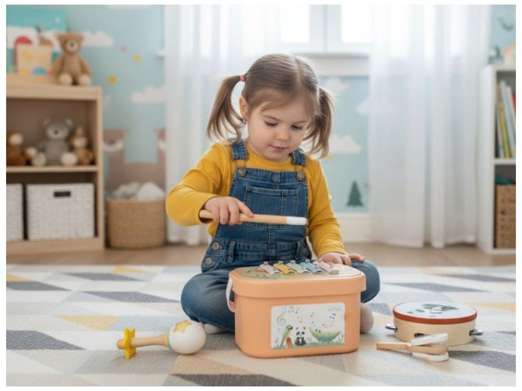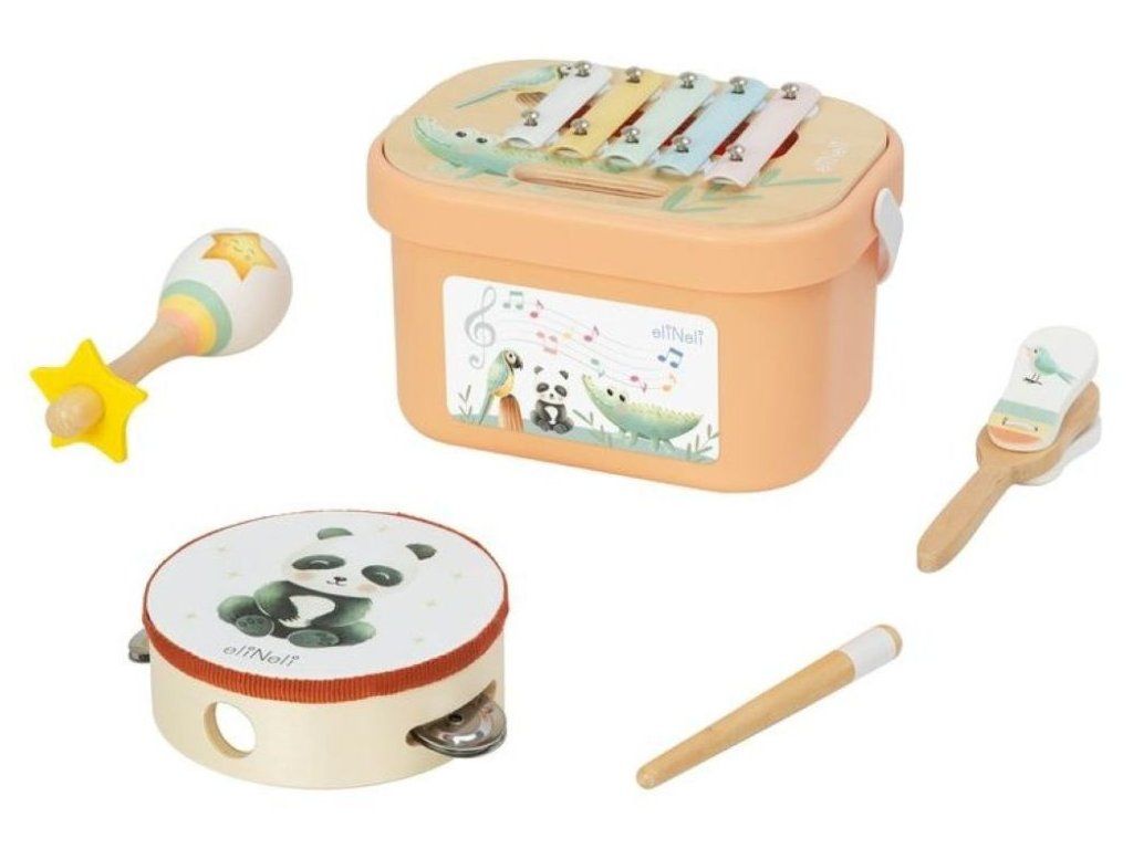 Praktický a prenosný dizajn Sada detských hudobných nástrojov je uložená v praktickom prenosnom boxe, takže si ich deti môžu zobrať kamkoľvek - na návštevu, oslavu alebo dovolenku. Box pojme všetky nástroje - tamburínu, kastanety, xylofón a rumba guľu, uľahčuje upratovanie a zabraňuje ich strate, takže sa deti môžu sústrediť na zábavu a rozvoj hudobných schopností. Prírodné materiály a bezpečnosť Hudobné nástroje sú vyrobené z prírodných materiálov a opatrené netoxickými vodou riediteľnými farbami, čo zaručuje ich bezpečnosť a ekologickosť. Sada je ideálna pre rodičov, ktorí chcú bezpečné a šetrné hračky. Rozvoj hudobných schopností Sada obsahuje tamburínu, kastanety, xylofón a rumba guľu, ktoré pomáhajú deťom rozvíjať hudobné schopnosti a sluchové vnímanie. Pri hre sa deti učia rozpoznávať zvuky a tóny, čo podporuje zmyslový rozvoj, kreativitu a zábavu. Krásne ilustrácie a neutrálne farby Hudobné nástroje aj box zdobia farebné ilustrácie so zvieratkami, ktoré lákajú deti na hranie. Neutrálne farby zaisťujú, že sada je vhodná pre dievčatká aj chlapcov. Atraktívny dizajn podporuje záujem detí o hudbu a umenie a robí sadu ideálnym darčekom na každú príležitosť. Technické parametre Rozmer boxu 22 x 16,5 x 13 cm Materiál jalovcové drevo, preglejka, plast, kov Certifikáty CE, 2009/48/ES, EN 71-1, EN 71-2 a EN 71-3 Odporúčaný vek od 18 mesiacov, 18m+ Výhody produktu Prečo si vybrať túto sadu Sada obsahuje štyri hudobné nástroje z prírodných materiálov, zdobené krásnymi ilustráciami so zvieratkami a neutrálnymi farbami, vhodné pre dievčatká aj chlapcov. Praktický box zaisťuje jednoduché prenášanie a ukladanie, a pri hre sa deti učia rozpoznávať zvuky a tóny, čím rozvíjajú zmysly aj hudobné schopnosti. Zábava pre všetkých S hudobnými nástrojmi môžete usporiadať koncert spoločne s deťmi. Výhody produktu Prírodné materiály Nástroje sú vyrobené z prírodných materiálov, čo zaisťuje ich ekologickosť a bezpečnosť pre deti. Jednoduché prenášanie Praktický box umožňuje jednoduché prenášanie a skladovanie, to uľahčuje upratovanie a zaisťuje, že sa žiadny nástroj nestratí. Rozvoj schopností Deti sa pri hre učia rozpoznávať rôzne zvuky a tóny, čo stimuluje ich zmysly a podporuje kreativitu. Krásne ilustrácie Hudobné nástroje a box sú zdobené krásnymi ilustráciami so zvieratkami, ktoré dodávajú sade lákavý vzhľad. Neutrálne farby Vďaka neutrálnym farbám je sada vhodná pre dievčatká aj chlapcov, to z nej robí skvelý darček na každú príležitosť. Bezpečnosť pre deti Farby a laky použité na nástrojoch sú na vodnej báze a netoxické, to zaisťuje bezpečnosť pre deti. My v ELIS DESIGN sme sami rodičia detí rôzneho veku a záleží nám na tom, s čím sa hrajú. Preto aj pre vaše deti vytvárame a vyberáme zmysluplné hračky z kvalitných, najlepšie prírodných, materiálov, inšpirované montessori, ktoré nielen zabavia, ale aj rozvíjajú. Aké nástroje sada obsahuje? Sada obsahuje tamburínu, kastanety, xylofón a rumba guľu uložené v boxe. Z akých materiálov sú nástroje vyrobené? Nástroje sú vyrobené z jalovcového dreva, preglejky, plastu a kovu. Pre aký vek je sada vhodná? Sada je odporúčaná pre deti od 18 mesiacov. Sú nástroje bezpečné pre deti? Áno, nástroje sú vyrobené z prírodných materiálov a farby sú netoxické. Rodičovský ťahák na chytré hranie a inšpiráciu z montessori pedagogiky https://play.elineli.eu/sk/ Viac o produktoch eliNeli https://www.elineli.eu/sk/