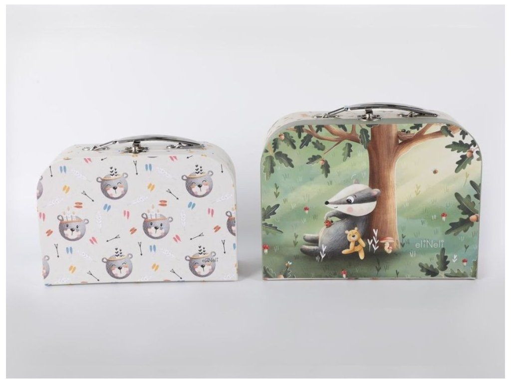 Štýlový dizajn s motívom jazveca a medveďov Sada kufríkov s motívom jazveca a medveďov prináša jedinečný dizajn, ktorý zaujme na prvý pohľad. Sada kufríkov ponúka dve veľkosti, ktoré sa prispôsobia vašim potrebám - či už potrebujete malý kufrík na drobnosti alebo väčší. Každý kufrík je starostlivo navrhnutý s ohľadom na detail, čo zaisťuje, že sa stane obľúbeným doplnkom detskej izbičky. Motívy zvierat dodávajú kufríkom hravosť a originalitu. Odolné materiály Kufríky sú vyrobené z vysoko kvalitných materiálov, ktoré zaisťujú ich odolnosť a dlhú životnosť. Nízka hmotnosť uľahčuje manipuláciu a prenášanie. V prrípade potreby môžete menší kufrík vložiť do väčšieho. Jednoduchá údržba a čistenie Bezproblémová starostlivosť o vaše kufríky Kufríky stačí len utrieť vlhkou handričkou a budú vyzerať ako nové. To šetrí čas a úsilie pri údržbe. Vďaka kvalitným materiálom zostávajú kufríky odolné proti bežným nečistotám a škvrnám. Výhody produktu Naša sada kufríkov ponúka unikátny dizajn, odolné materiály a praktické rozmery. Jednoduchá údržba a dlhá životnosť sú ďalšími výhodami, ktoré ocení každý užívateľ. Navyše sú kufríky ľahké a jednoducho prenosné, je možné ich vložiť do seba pre úsporu miesta. Technické parametre Parameter Hodnota Rozmery väčšieho kufríka 8,2 x 17 x 23 cm Materiál Umelecký papier, biela lepenka, kartón, kov Certifikáty, normy CE, EN-71,2,3 Vek Od 3 rokov, 36m+ Výhody produktu Unikátny dizajn Motív jazveca a medveďov zaisťuje, že kufríky vyniknú v každej izbičke. Odolné materiály Vysoko kvalitné materiály zaisťujú dlhú životnosť a odolnosť kufríkov. Praktické rozmery Dve veľkosti kufríkov sa prispôsobia všetkým vašim potrebám. Jednoduchá údržba Kufríky je možné jednoducho čistiť, čo šetrí čas a úsilie. Ľahká konštrukcia Ľahké materiály uľahčujú prenášanie a manipuláciu s kufríkmi. Z akého materiálu sú kufríky vyrobené? Kufríky sú vyrobené z umeleckého papiera, bielej lepenky, kartónu a kovu. Odolné materiály zaisťujú ich odolnosť a dlhú životnosť. Sú kufríky vhodné pre deti? Áno, kufríky sú vhodné pre deti vďaka svojmu hravému dizajnu a ľahkej konštrukcii. Ako sa kufríky čistia? Kufríky je možné jednoducho čistiť vlhkou handričkou, čo zaisťuje ich dlhodobú krásu. Rodičovský ťahák na chytré hranie a inšpiráciu z montessori pedagogiky https://play.elineli.eu/sk/ Viac o produktoch eliNeli https://www.elineli.eu/sk/