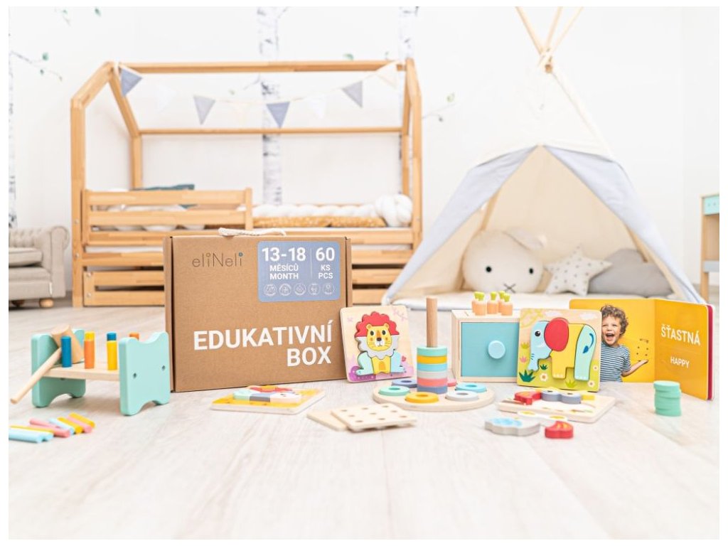 eliNeli je česká značka drevených hračiek a nábytku s jedinečným farebným dizajnom a so zahraničnou výrobou. Produkty eliNeli rozvíjajú kreativitu a pohybový potenciál detí, skvele zapadnú do interiéru a vracajú sa k tradičnému materiálu — k drevu. Unikátna na značke je dizajnová kombinácia prírodných a neskorých letných až jesenných farieb, ktoré sa hodia do minimalistického scandi interiéru, a ktoré inde nenájdete. To všetko za veľmi dostupné ceny. Sada drevených puzzle s roztomilými zvieratkami vo veselých farbách láka k preskúmaniu a k hre. Slon, lev, ježko a sova deti zabavia a zdokonalia ich schopnosti. Pri skladaní puzzle deti potrénujú jemnú motoriku, koordináciu očí a rúk, priestorovú predstavivosť, naučia sa poznávať tvary a farbičky. Farebné kelímky s ovocím a s číslami ponúkajú množstvo možností na hranie. Kelímky rôznej veľkosti môžu deti stohovať, postaviť vysokú vežu, rozložiť vedľa seba, hrať sa s nimi vo vani aj na piesku. Fantázii a spôsobu použitia sa medze nekladú - zábavu deťom zaistia doma aj vonku. Pri hre s kelímkami sa deti učia poznávať ovocie (anglické názvy), farbičky, číslice, rozdiel medzi malý, veľký, väčší, menší, zdokonaľujú jemnú motoriku, koordináciu očí a rúk, logické myslenie a priestorovú predstavivosť. Nasadzovacie krúžky v lákavých farbách motivujú deti k preskúmaniu a k hre. Drevené krúžky deti berú do rúk, hrajú sa s nimi, kotúľajú, vkladajú do pripravených otvorov a nasadzujú na stojanček. Vkladanie a nasadzovanie potrénuje jemnú motoriku, koordináciu očí a rúk, manuálnu zručnosť, učí deti poznávať farbičky, podporuje detskú fantáziu. Montessori hra v podobe multifunkčnej debničky si pre deti pripravila nie jedno prekvapenie. Vzdelávacia hračka 3v1 so šuplíkom a s vymeniteľnými doštičkami ponúka rôzne obmeny a trénuje rôzne schopnosti. Môže byť pokladničkou aj originálnou vkladačkou s mrkvičkami a farebnými valčekmi. Hra prináša deťom zábavu, trénuje motorické schopnosti, koordináciu očí a rúk, logické myslenie, kritické myslenie, deti sa učia riešiť problémy, farbičky, poznávať tvary. Zatĺkačky v rôznej podobe sa u detí tešia veľkej obľube. Zatĺkačka s farebnými valčekmi a paličkou umožní deťom tĺcť do valčekov, po zatlčení zatĺkačku otočiť a opakovať túto činnosť z druhej strany. Drevená zatĺkačka s plastovými valčekmi podporuje motorické schopnosti, koordináciu očí a rúk, učí deti poznávať farbičky, podporuje kreativitu. Detská knižka s obrázkami a popismi emócií v českom aj anglickom jazyku zoznámi deti s ich pocitmi. Kniha pomôže deťom pochopiť ich nálady, ktoré sa počas dňa menia a pomôže im s nimi pracovať. Môže byť názornou ukážkou emócií, ktoré deti prežívajú, vo chvíli, kedy im nie je do reči. Kniha s náladami učí deti rozpoznať svoje emócie, pomenovať ich, môže byť pomocníkom pre zvládanie emócií a pri práci s nimi. Edukatívny box obsahuje: sadu puzzle so zvieratkami, stohovacie kelímky (veža), nasadzovaciu hru, edukačnú montessori hru, zatĺkačku, knihu - moja nálada (české a anglické výrazy), popis hračiek a návody k hre v českom a anglickom jazyku. Rozmery boxu: cca 32 x 26 x 14 cm. Materiál: jalovcové drevo, preglejka, papier, plast. Odporúčaný vek: od 13 do 18 mesiacov veku. Tip: Edukačné boxy u nás nájdete pre rôzne vekové skupiny. Tento, pre deti vo veku 13 - 18 mesiacov, a ďalšie pre deti vo veku 0 - 6 mesiacov, 7 - 12 mesiacov, 19 - 24 mesiacov, 25 - 36 mesiacov a pro deti staršie 36 mesiacov. Edukačný box vám uľahčí výber darčeka, obsahuje vždy najvhodnejší súbor hračiek a hier pre deti v danom veku. Viac o produktoch eliNeli nájdete na: https://www.elineli.eu/sk/. POZRITE SI BOX S EDUKATÍVNYMI HRAČKAMI PRE DETI VO VEKU 13 - 18 MESIACOV:Dodatočné parametre