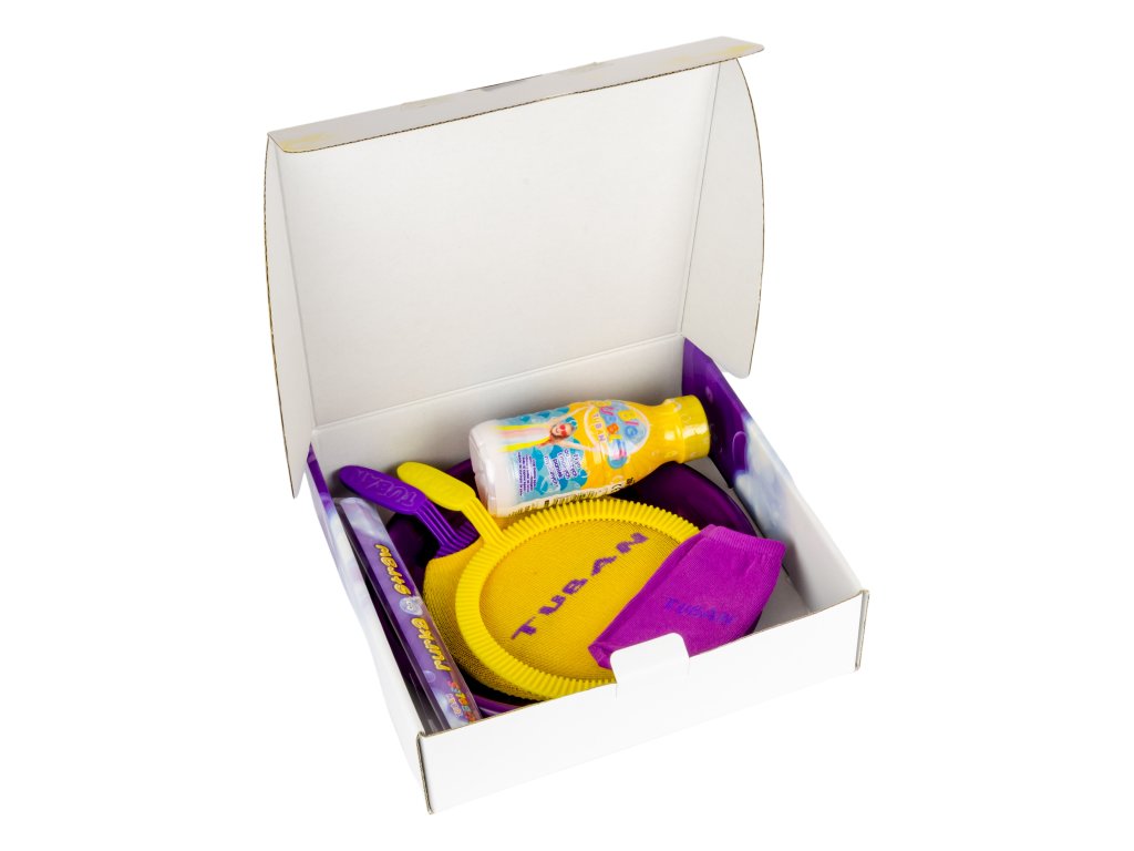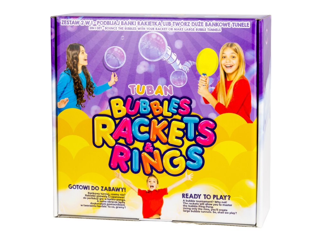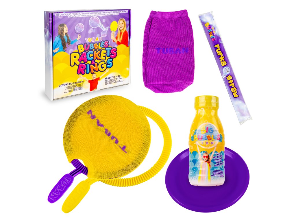 Sada Rakety a obruče na bubliny + tekutina 250 ml Bublinová zábava pre malých aj veľkých Vstúpte do sveta skákajúcich mydlových bublín a zažite nekonečnú zábavu s touto jedinečnou sadou! Vďaka špeciálnej tekutine a praktickým pomôckam si deti aj dospelí môžu ľahko vytvoriť odolné bubliny, ktoré môžu dokonca chytať. Pomocou rakiet so špeciálnym poťahom si navyše môžete zahrať bublinový ping-pong – skvelú hru, ktorá rozvíja koordináciu a zručnosť.Všetko, čo potrebujete na bublinové hry Súprava obsahuje:250 ml tekutiny,2 plastové obruče, plastový tanier na tekutinu, 2 látkové poťahy na rakety slamku na fúkanie bublín.Najlepšie výsledky dosiahnete pri hraní v interiéri, kde bubliny vydržia najdlhšie. Bublifuky značky TUBAN sú výnimočné svojím unikátnym zložením tekutiny, vďaka ktorému vytvárajú odolné a veľké bubliny, ktoré prinášajú radosť celej rodine!Dodatočné parametre