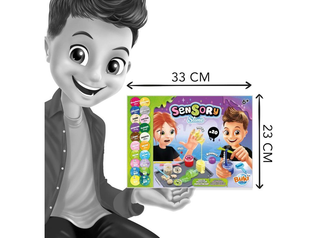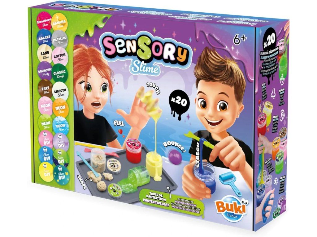 Objavte svet zábavných a jedinečných textúr s BUKI - Sensorický Sliz! Táto súprava umožňuje vytvoriť a objaviť až 20 rôznych druhov slizov – od skákacieho a svietiaceho slizu až po neónový, bavlnený, metalický či galaktický. Ide o relaxačnú a zmyslovú hračku, ktorá je ideálna pre deti od 6 rokov.
