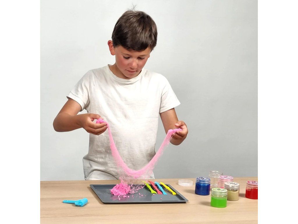 Súprava obsahuje hotové slizy v hermeticky uzavretých nádobkách a tiež DIY (urob si sám) slizy, ktoré si deti môžu vytvoriť samostatne pomocou pripravených ingrediencií. Súčasťou balenia je 5 nástrojov na modelovanie, hnetenie a miešanie slizov, ako aj praktická silikónová podložka na ochranu stola – zaručuje čisté a pohodlné hranie bez neporiadku.