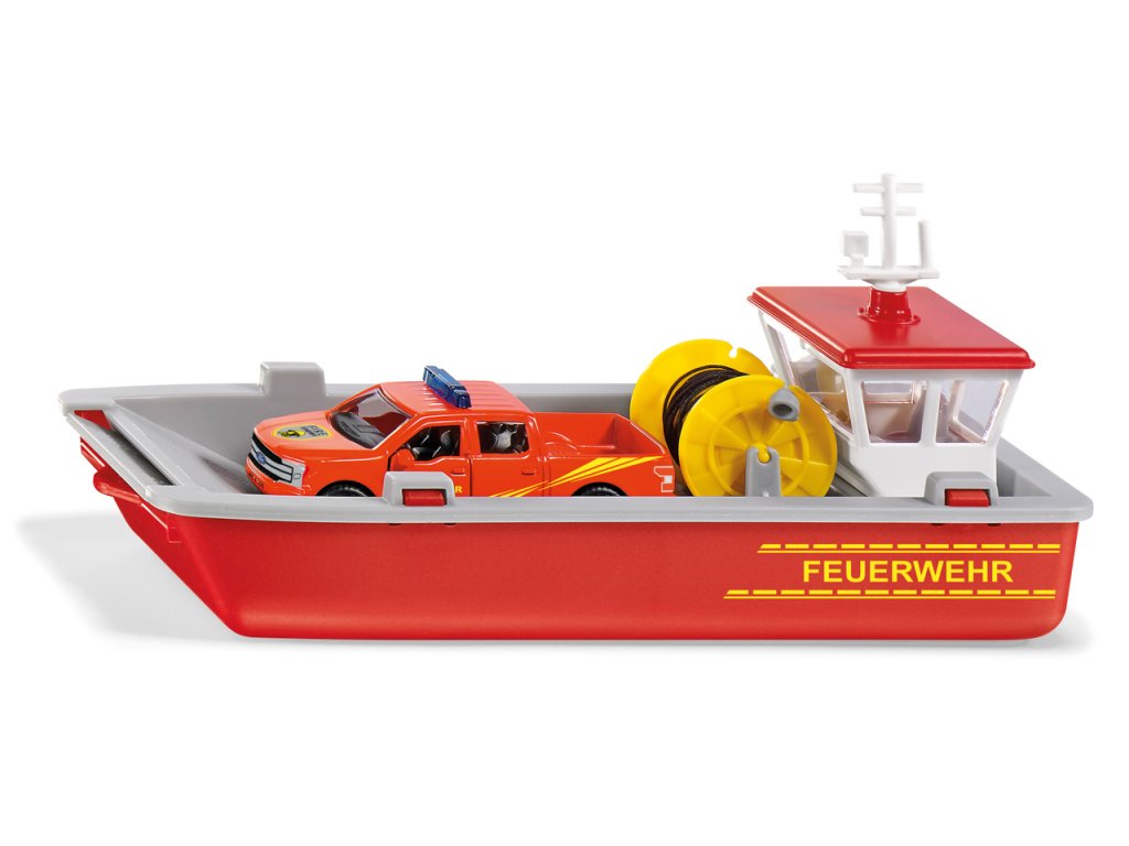 SIKU Super – člun převážející hasičské auto. Na jezerech a řekách je hasičský sbor připraven se svými pracovními čluny. Většinou řeší nehody jako znečištění vody, stavění ropných bariér, poskytování technické pomoci nebo hašení malých požárů na poškozených lodích. Za tímto účelem se naviják hadice otáčí a lze hadici odvíjet. Pro akci na souši je na palubě také pickup Ford F150. Aby mohl sjet z člunu, rampa se při přistání člunu sklopí. Otevřete dveře, nastupte a hra může začít. Součástí balení je 64 samolepek. Měřítko: 1:50. Rozměr balení: 25,5 x 11,5 x 8,8 cm. Věk: 3+. Video: https://www.youtube.com/watch?v=LltrhznJdSEDodatočné parametre