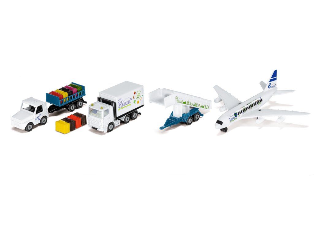 SIKU Super – Letiskový odbavovací set. Nová sada SIKU letiska sa skladá z štvorpruhového komerčného lietadla, zásobovacieho cateringového auta, vozidla s vlečkou a kuframi cestujúcich, prívesom so schodmi a päťmetrovou samolepiacou páskou s pristávacou dráhou. Výška batožinového prívesu je nastaviteľná pomocou nožnicového mechanizmu. Otváracie klapky uľahčujú nakladanie a vykladanie. Vlečku s kuframi je možné odpojiť a vymeniť za príves so schodmi. Lepiaca páska s pristávacou dráhou sa dá prilepiť na hladké podlahové krytiny alebo koberec s krátkym vlasom. Kufre cestujúcich je možné otvoriť. Rozmer balenia: 355 x 210 x 60 mm. Vek: 3+Dodatočné parametre