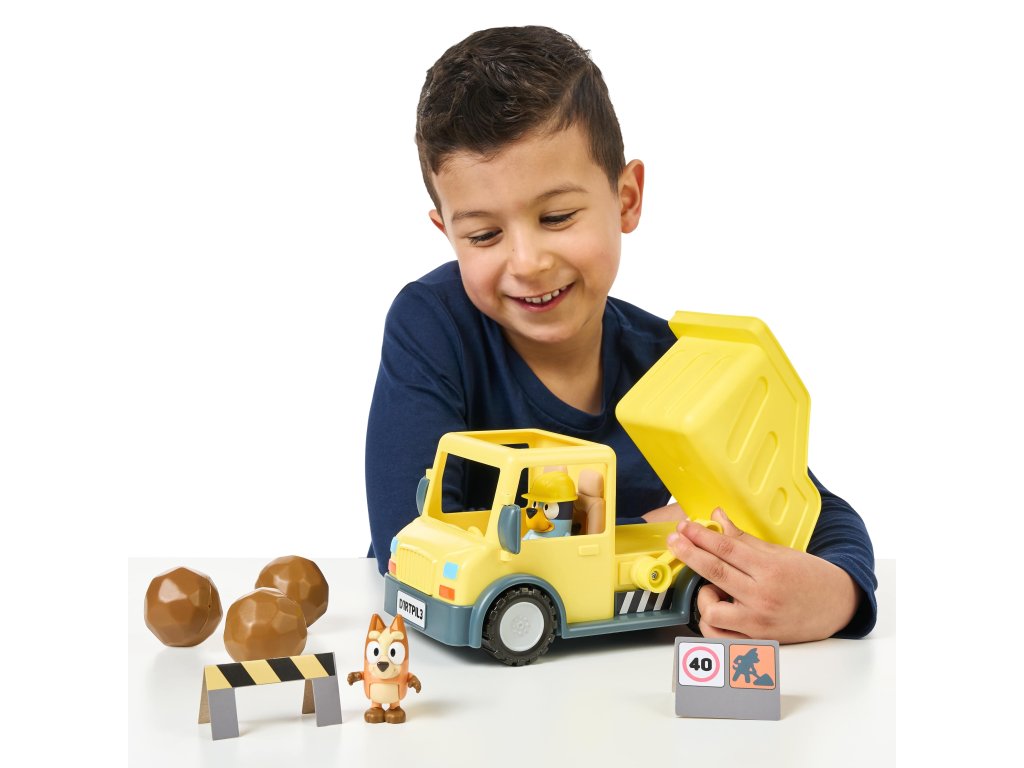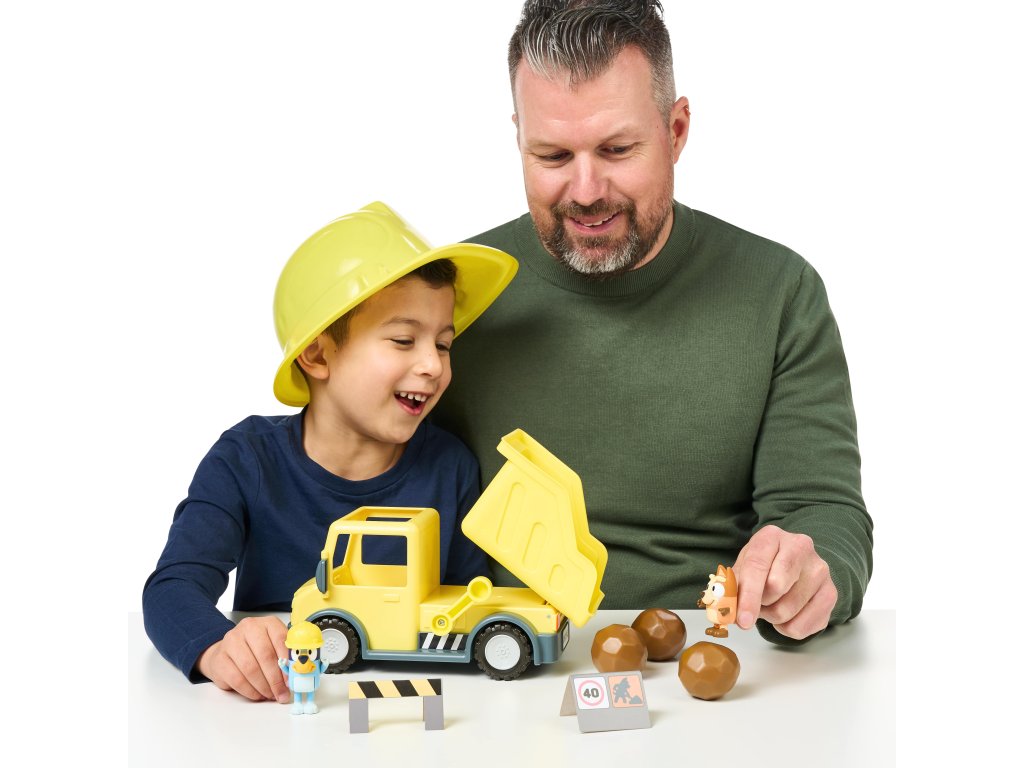 Sklápač s 2 figúrkami Bluey Stavebný sklápač pre malých pomocníkov na stavbe Pripravte sa na dobrodružstvo na stavenisku s Bluey a jej sestrou Bingo! Tento hrací set obsahuje žltý sklápací nákladný automobil s pohyblivou korbou, ktorý umožňuje realistickú hru. Súčasťou sú exkluzívne figúrky Bluey s ochrannou prilbou a Bingo s „zablatenými“ labkami. Sú pohyblivé a môžu sedieť v kabíne nákladného auta, čo podporuje interaktívnu hru a rozvoj detskej predstavivosti.Výbava pre malých staviteľov Žltý sklápací nákladný automobil s pohyblivou korbouExkluzívna figúrka Bluey s ochrannou prilbouExkluzívna figúrka Bingo so „zablatenými“ labkami3 hnedé balvany na nakladanie a vykladanie2 výstražné značky pre bezpečnú hruSamolepky na prispôsobenie nákladného autaVhodné pre deti od 3 rokovTento set je ideálny pre deti, ktoré milujú stavebné stroje a dobrodružstvá s obľúbenými postavičkami zo seriálu Bluey. Podporuje kreativitu, motorické zručnosti a zábavu pri hre.Dodatočné parametre
