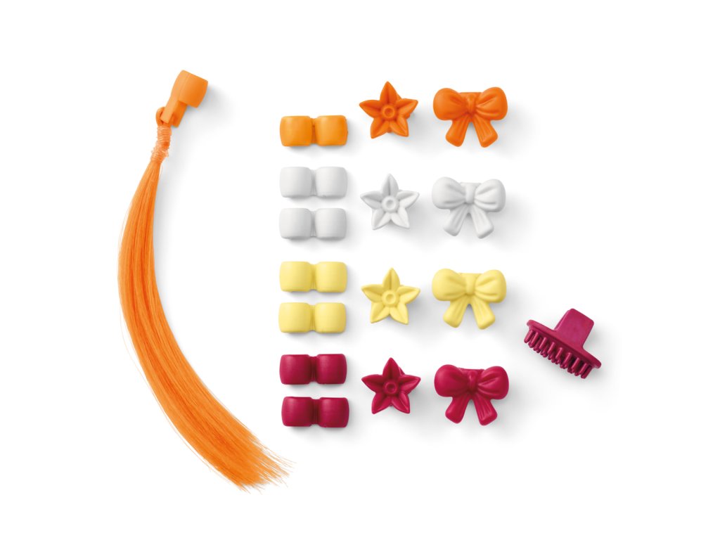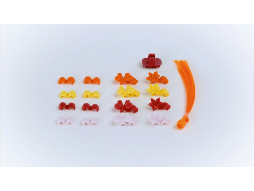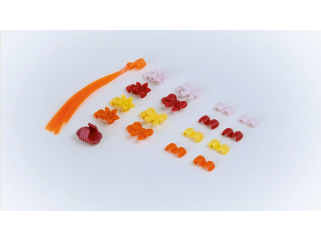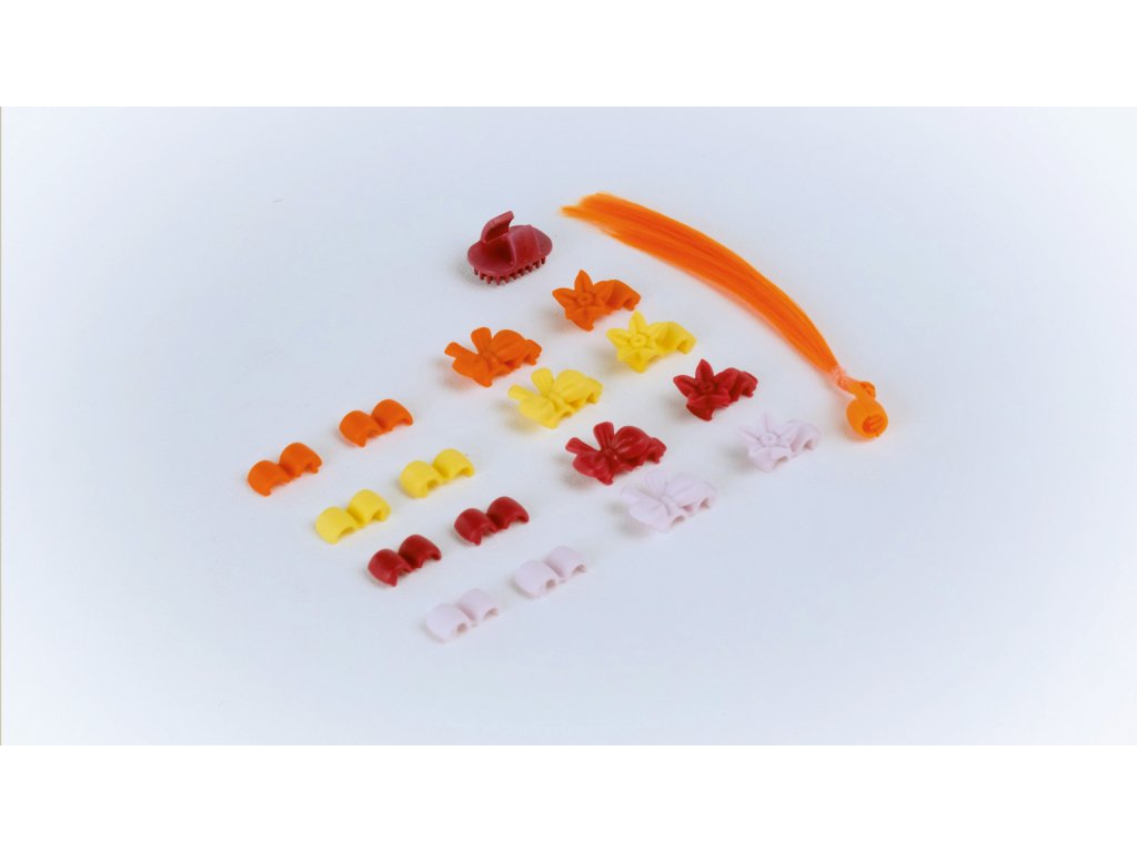 S týmito skvelými sponkami je starostlivosť o kone oveľa zábavnejšia! Malý kefku na prst dodá lesk každej hrive a chvostu! Ťažko sa rozhodnúť, aké doplnky koňovi do účesu vybrať... Korálky, kvetiny i mašle vyzerajú skvele. Mali by byť skôr farebné, alebo trochu decentnejšie? Je tu dokonca aj oranžový prameň do hrive navyše, ktorý je obzvlášť šik. Tento kôň vyzerá tak nádherne, že je nutné s ním vyjsť na prejížďku, aby sa ukázal! Rozmery: 12,5x16x1,5cm. Vhodné pre deti od 3 rokov.Dodatočné parametre