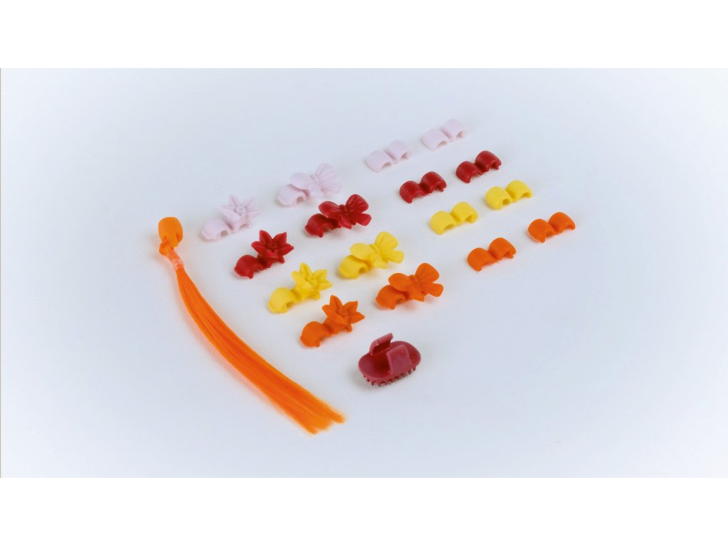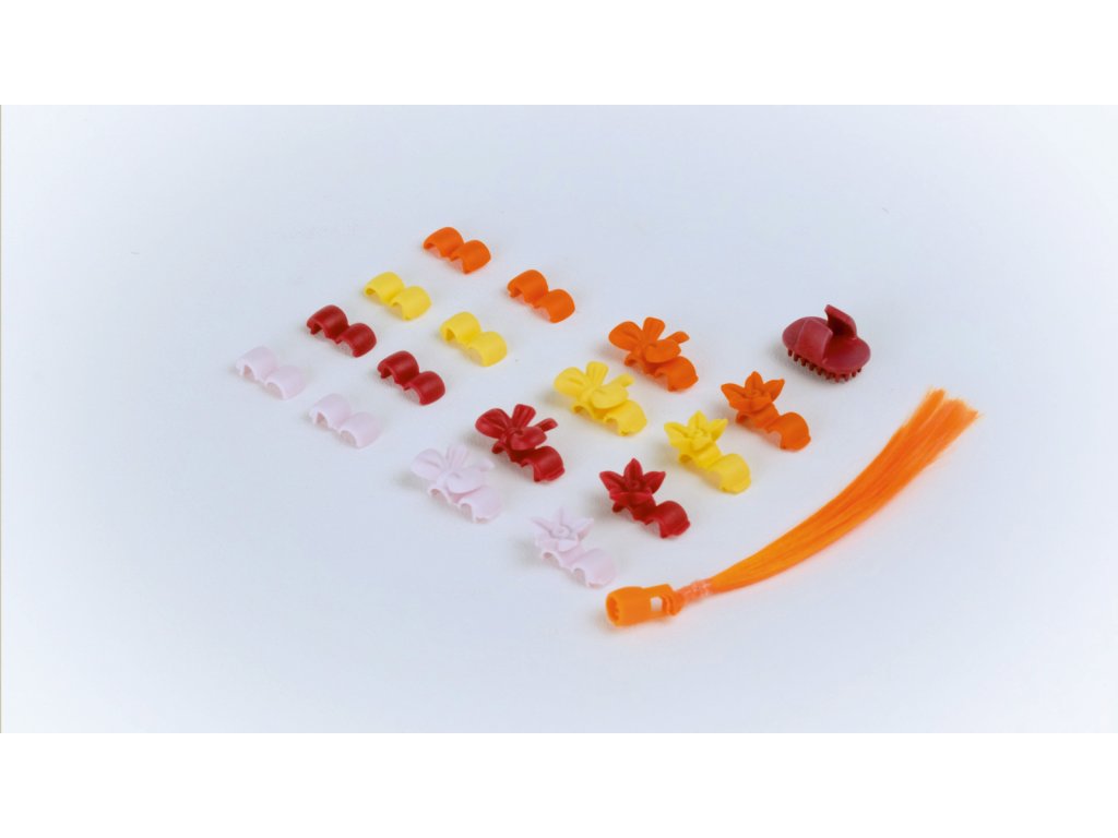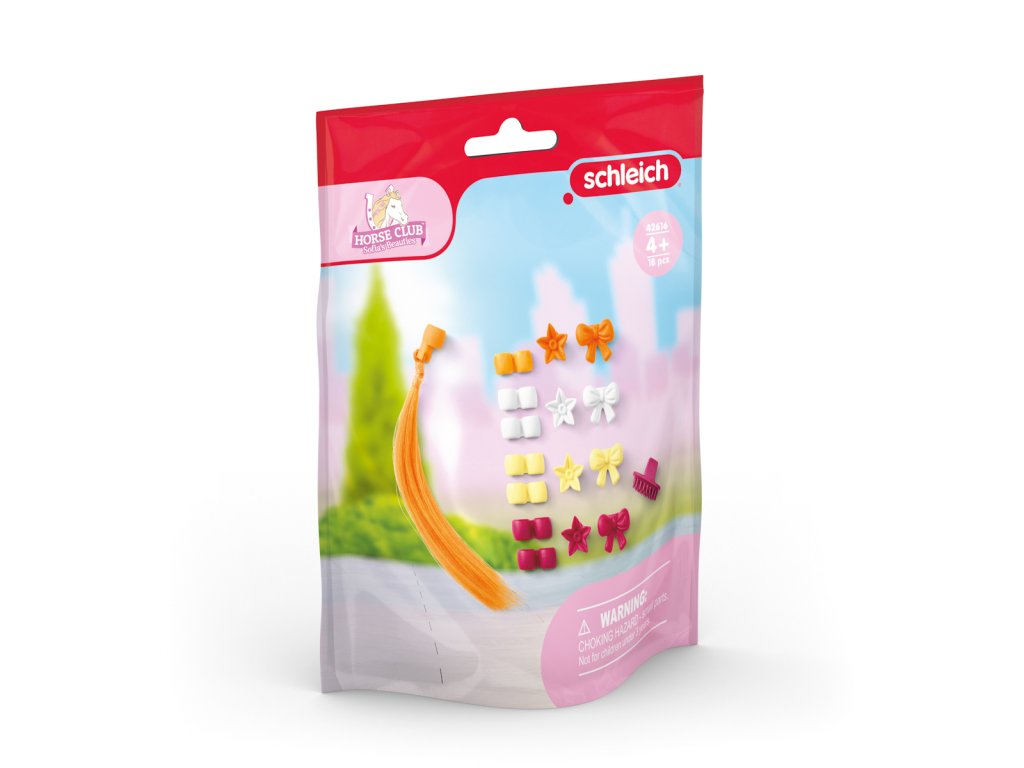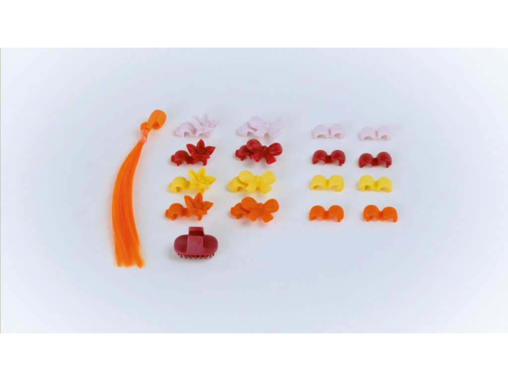 S týmito skvelými sponkami je starostlivosť o kone oveľa zábavnejšia! Malý kefku na prst dodá lesk každej hrive a chvostu! Ťažko sa rozhodnúť, aké doplnky koňovi do účesu vybrať... Korálky, kvetiny i mašle vyzerajú skvele. Mali by byť skôr farebné, alebo trochu decentnejšie? Je tu dokonca aj oranžový prameň do hrive navyše, ktorý je obzvlášť šik. Tento kôň vyzerá tak nádherne, že je nutné s ním vyjsť na prejížďku, aby sa ukázal! Rozmery: 12,5x16x1,5cm. Vhodné pre deti od 3 rokov.Dodatočné parametre