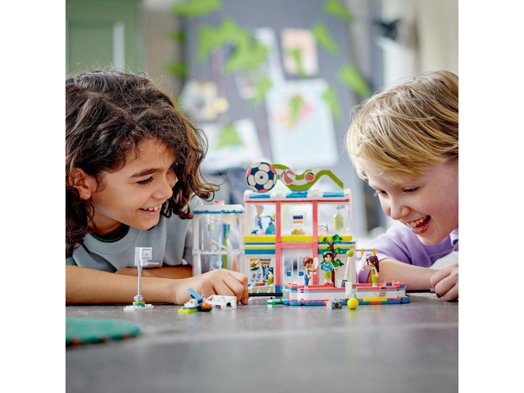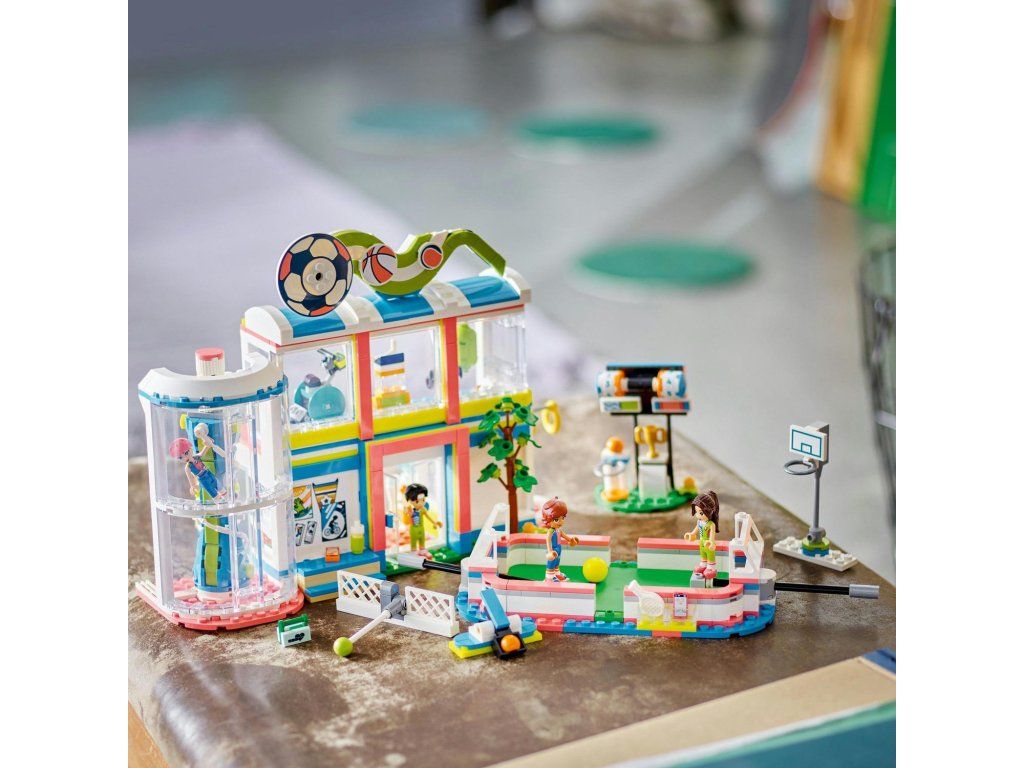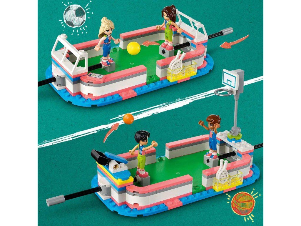 Spravte radosť milovníkom športov od 8 rokov so stavebnicou LEGO® Friends Športové stredisko (41744). Balenie obsahuje 4 minifigúrky a množstvo doplnkov vrátane ihriska, ktoré možno upraviť výmenou bránky a siete pre rozličné športy. Stavebnica obsahuje aj stojany na minibábiky a rôzne lopty, takže deti sa môžu s postavičkami hrať naozaj. Po futbalovom tréningu vymeňte bránky za tenisovú sieť a strieľajte cez ňu tenisové loptičky. Následne ho zmeňte na basketbalový kôš a precvičte si strely basketbalovou loptou. V balení nájdete aj tabuľu s výsledkami a priestor, kam môžete uložiť loptičky. Vo vnútri budovy športového strediska môžu deti vyskúšať aj posilňovňu, lezeckú stenu a šatňu. Rozprúďte zábavu Deti sa môžu tešiť na intuitívne stavanie vďaka aplikácii LEGO Builder, ktorá deťom umožňuje modely si približovať, otáčať v 3D prostredí, ukladať si ich a sledovať postup stavania. Spoznajte novú generáciu mestečka Heartlake Inšpirujte deti k rozvíjaniu záľub pri objavovaní nového sveta LEGO Friends s partiou rôznorodých postáv.Dodatočné parametre