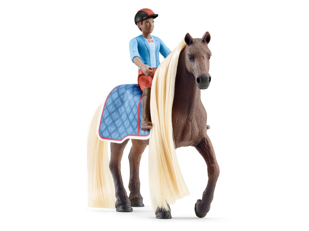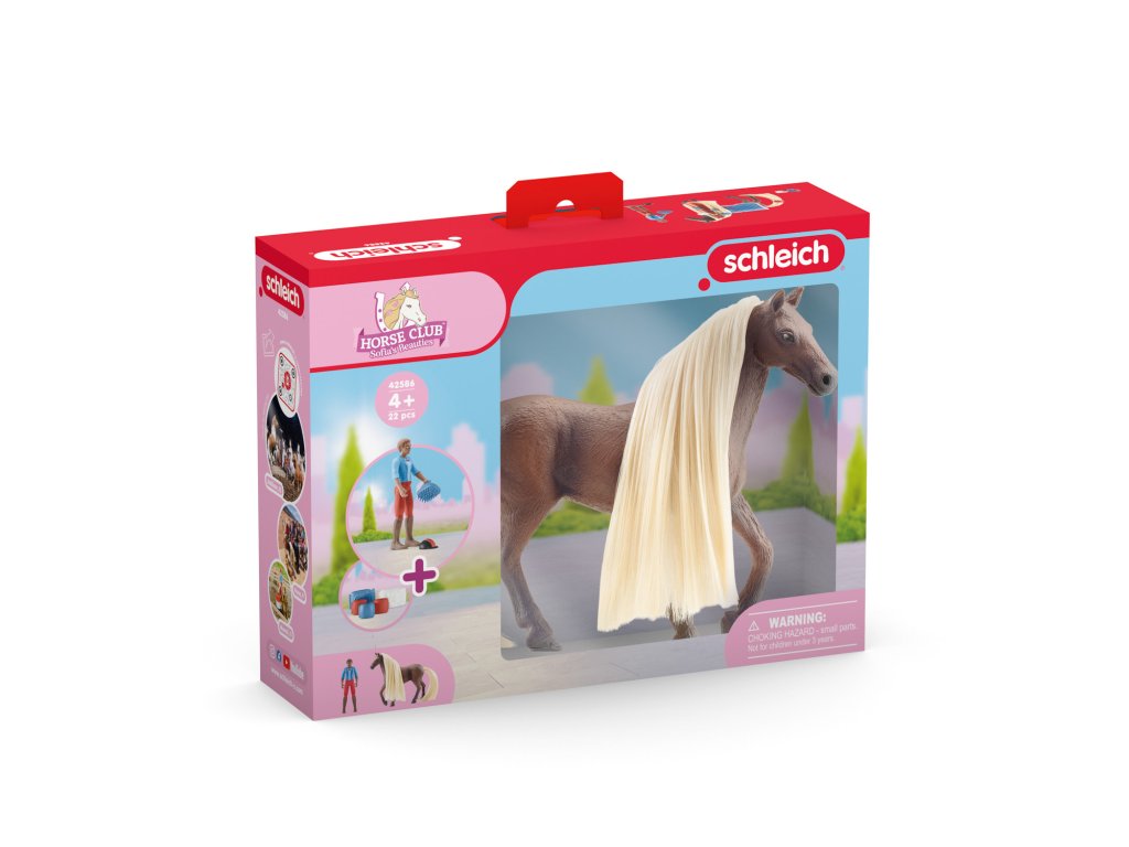 A prvé miesto získavaaaa… Leo a Rocky zo štartovacej sady Schleich® HORSE CLUB Sofia's Beauties. Takéto oznámenie z reproduktorov počuješ pomerne často. Niet divu, pretože plne pohyblivá figúrka Lea a jeho koňa plemena Rocky Mountain s kartáčovateľnou hrivou sú pravým víťazným tímom. Nielen z drezúry, ale aj z prekážkových skokov si obvykle privážajú domov zlato. Vďaka tvojej pomoci tiež radi trénujú na tých najhrboľatejších tratiach a skáču zo zeme na zadný sedák. Žrebec sa hrdo rozkročí nad stolom a predvedie svoju hrivu. Rýchlo, je čas pripraviť sa na udeľovanie cien! To ale nie je najmenší problém, pretože hrivu a chvost môžeš ľahko a rýchlo vymeniť. Potom už stačí len narovnať farebné sponky a koráliky do hrivy… a slávnostné udeľovanie cien môže začať. Sada obsahuje: 1× kôň plemena Rocky Mountain s kartáčovateľnou hrivou a chvostom, 1× plne pohyblivá figúrka Leo, 1× deka pre koňa, 1× jazdecký klobúk, 1× sponky do hrivy, 1× koráliky do hrivy, 1× príčesok, 1× kefka. Rozmery: 18,7 x 24,5 x 6 cm Vek: 3+Dodatočné parametre