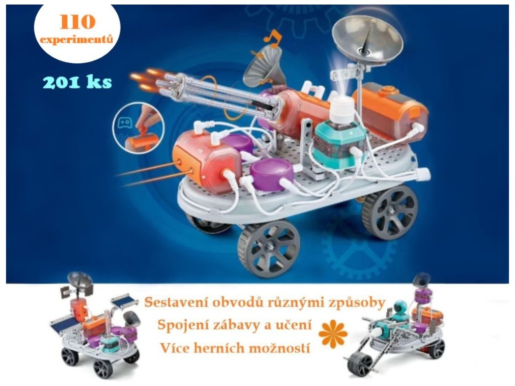 Náučná stavebnica nielen pre deti Jedinečná vzdelávacia stavebnica so 110 rôznymi experimentami prináša deťom nielen zábavu, ale aj prvé kroky do sveta fyziky. S jednoduchými dielikmi môžu malí stavitelia skúšať rôzne kombinácie a učiť sa, ako funguje princíp elektrického obvodu. Možnosť zostaviť obvod niekoľkými spôsobmi podporuje kreativitu, logické myslenie, predstavivosť, technickú zručnosť a chuť experimentovať. Hračka spája zábavu s učením a poskytuje priestor na objavovanie vedy zábavným spôsobom. Ponúka kvalitné spracovanie z bezpečných materiálov, ktoré spĺňajú medzinárodné certifikácie. Na plné fungovanie je potrebná 4x 1,5V AA batéria (nie sú súčasťou balenia). Technické parametre: Obsah balenia: 201 ks. Rozmery balenia: 8,2 x 46,5 x 35,3 cm (výška x šírka x dĺžka). Batérie: 4x 1.5V AA (nie sú súčasťou balenia). Materiál: ABS. Certifikáty a normy: CE, EN71, 10P, ASTM, HR4040, PAHS, CA65 and RoHS. Odporúčaný vek: od 3 rokov, 3+.Dodatočné parametre
