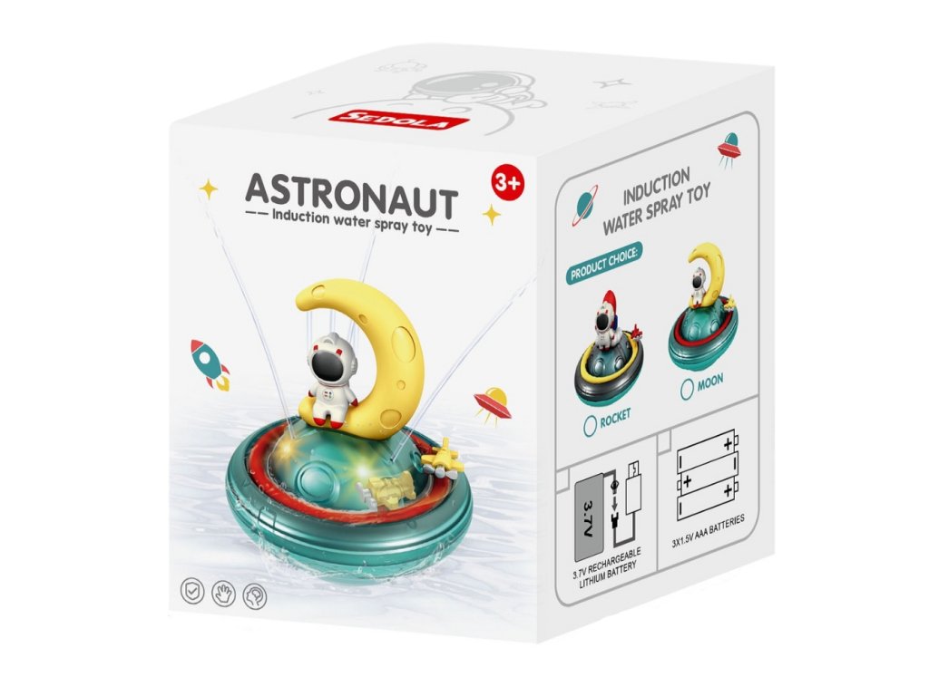 Striekacia hračka do vody Astronaut RaketaStriekacia hračka pre malých astronautovStriekacia hračka do vody Astronaut Raketa premení kúpanie na vesmírnu misiu plnú vody, svetiel a fantázie. Po položení na hladinu sa cez indukčný spínač automaticky aktivuje čerpadlo, ktoré vytvára prúdy vody smerujúce nahor z okraja prstenca, pričom loďka môže jemne rotovať. Farebné LED svetlá vo vnútri základne rozžiaria vodu a vytvárajú efekt malého vesmírneho kolotoča, ktorý deti fascinuje pri kúpaní aj v bazéne. Hračka podporuje zmyslové vnímanie, predstavivosť a motivuje deti, aby si kúpanie spájali s príjemným zážitkom. Astronaut Raketa je vyrobený z kvalitného plastu s hladkými hranami, batérie sú ukryté v utesnenom priestore určenom na kontakt s vodou, vďaka čomu je vhodný pre deti od 3 rokov. Ide o výborný darček pre malých fanúšikov vesmíru, ktorí milujú vodné hry a radi sledujú, ako prúdy vody striekajú do všetkých strán.Dodatočné parametre