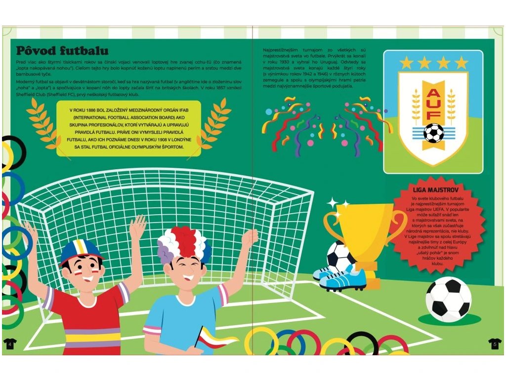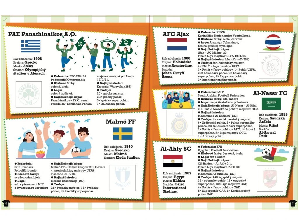 Svetové futbalové kluby so samolepkamiV tejto knižke sa zoznámite s 80 futbalovými klubmi z celého sveta - od najstarších až po tie, ktoré vznikli v 21. storočí.Zaujímavosti o futbalových kluboch z celého sveta v knihe aktivit s veľkým množstvom samolepiek s logami futbalových klubov.Pri každom klube nájdete nielen základné geografické informácie, ale aj zaujímavosti o klubových farbách či logách. Štatistické údaje týkajúce sa mužských tímov zahŕňajú nielen najlepších strelcov a počty strelených gólov, ale i trofeje, ktoré sa klubu v priebehu histórie podarilo získať. Zoznámite sa aj so základnými pravidlami futbalu a s pôvodom tohto športu. V neposlednom rade objavíte a dolepíte SAMOLEPKY obsahujúce logá jednotlivých klubov, ktoré informácie v knihe výborne dopĺňajú.Dodatočné parametre