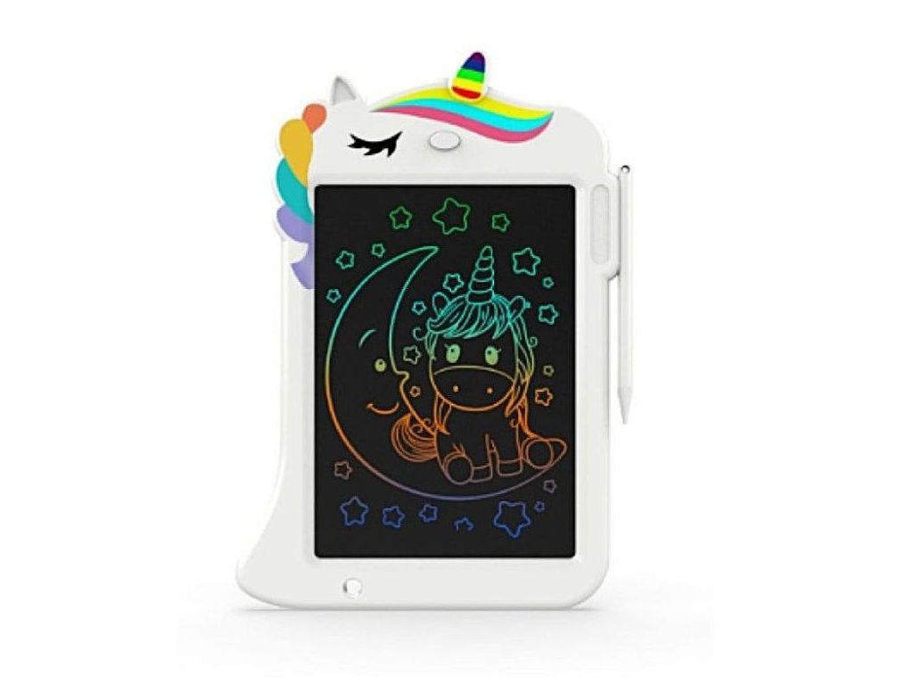 Tablet pre deti - tabuľka na kreslenie a písanie Z prvého tabletu bude nadšené každé dieťa túžiace po technických vymoženostiach. Tabuľka na kreslenie pre deti, v originálnom dizajne, v podobe bieleho jednorožca umožní deťom hrať sa na tablete - kresliť a písať stále dookola a dookola. Tabuľka na kreslenie totiž umožňuje kresliť farebné umelecké diela, pochváliť sa s nimi, zmazať pomocou tlačidla a vytvoriť nové. Čierna tabuľka (tablet) môže poslúžiť aj na výuku, na prvé zoznámenie s tvarmi, písmenkami alebo číslicami. Pri hre s týmto tabletom deti rozvíjajú svoju fantáziu a kreativitu, učia sa nové znalosti (s pomocou rodičov sa zoznamujú s abecedou, číslami a počtami, geometrickými tvarmi). Technické parametre: Rozmer: 26,5 x 17,2 x 1,1 cm. Rozmer balenia: 20,7 x 2,2 x 29,2 cm. Hmotnosť: cca 300 g. Materiál: plast. Certifikáty: CE, EN-71,2,3 Odporúčaný vek: od 3 rokov, 36m+.Dodatočné parametre