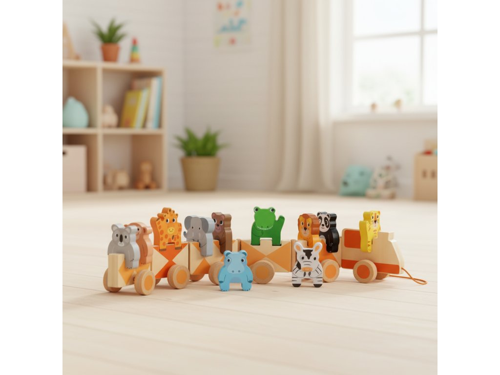 Ťahací vláčik Džungľa Prvý vláčik na ťahanie: lokomotíva a vagóniky z džungle, ktoré idú s dieťaťom na každé dobrodružstvoŤahací vláčik Džungľa je drevená hračka na ťahanie, ktorá spája pohyb s hrou na zvieratká.Dieťa vláčik ťahá za šnúrku a sleduje, ako vagóniky idú za ním – prirodzene tak trénuje rovnováhu, koordináciu a istotu pri chôdzi.Vláčik zároveň podnecuje fantáziu: džungľové motívy a dieliky na vagónikoch motivujú deti vymýšľať si príbehy o výprave, presúvať „náklad“, zastavovať na staniciach a hrať sa na cestovanie.Je to hračka, ktorá funguje v pohybe aj v pokojnej hre na podlahe.Rýchly prehľad odporúčaný vek: od 18 mesiacov rozvíja: hrubú motoriku, koordináciu, stabilitu pri chôdzi, predstavivosť v balení: drevený ťahací vláčik so šnúrkou a džungľovými prvkami na vagónikochPrečo si ho deti zamilujú motivuje k pohybu – dieťa vláčik „vedie“ za sebou zábava pri zatáčaní a obchádzaní prekážok – vagóniky pekne sledujú trasu džungľová téma podporuje rolové hry a rozprávanie príbehov pevné drevené spracovanie vhodné na časté hranieObsah balenia 1× drevený ťahací vláčik (lokomotíva + vagóniky) 1× šnúrka na ťahanie zvieratká na hranie na vagónikochTechnické parametre materiál: drevo typ hračky: ťahacia hračka / vláčik využitie: doma na podlahe, v izbe, na hranie v pohybeDodatočné parametre