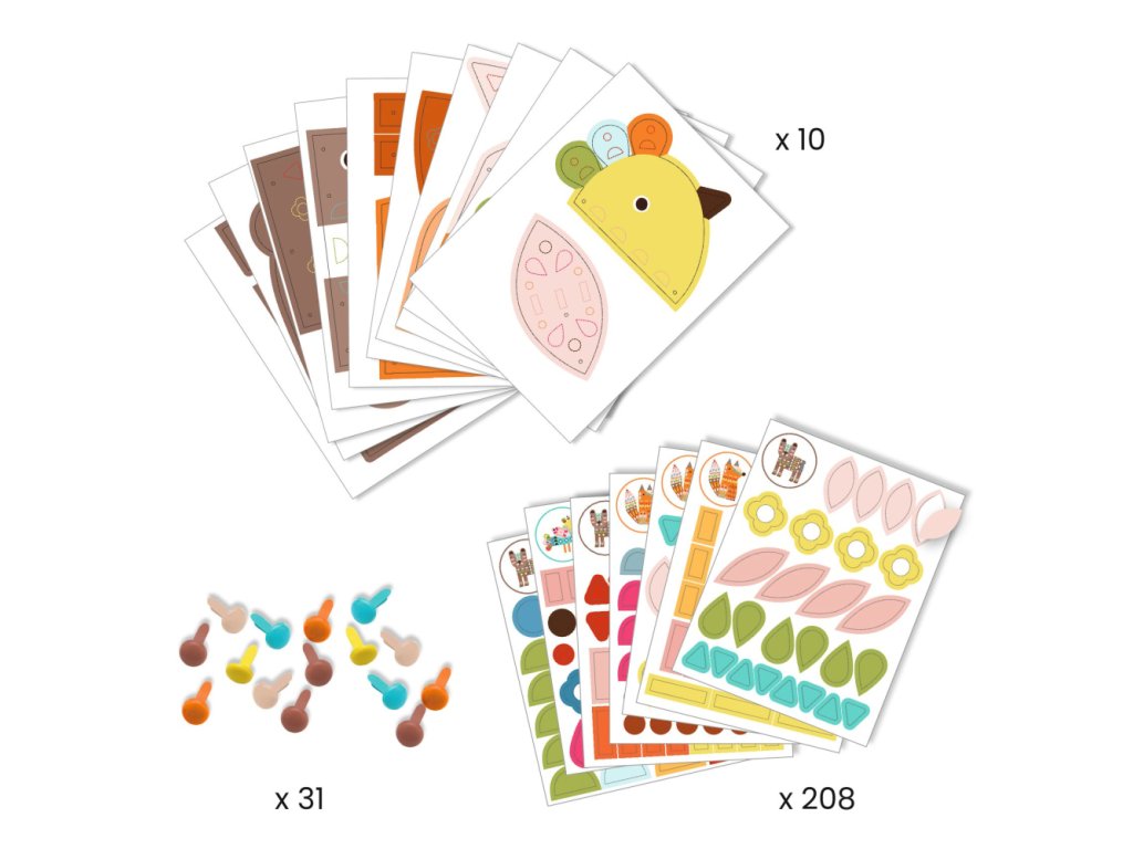Tvorenie s papierom: 3 obrovské zvieratká Kreatívna sada na zdobenie medveďa, líšky a vtáčika Tvorenie s papierom: 3 obrovské zvieratká od Djeco je kreatívna sada určená pre deti predškolského veku. Táto sada kombinuje koláž a skladanie, čím rozvíja jemnú motoriku, trpezlivosť a kreativitu. Deti môžu:• ozdobiť jednotlivé diely medveďa, líšky a vtáčika farebnými samolepkami• samolepky spojiť pomocou roztváracích cvočkov• výsledkom sú tri obrovské, farebne vzorované zvieratká, ktoré môžu slúžiť ako dekorácia alebo hračkaPrečo si vybrať zadu od Djeco• vhodné pre deti od 3 rokov• 3 veľké zvieracie predlohy na tvorenie• podporuje kreativitu, predstavivosť a tvorivosť• jednoduché lepenie a dekorovanie• výsledné modely môžu poslúžiť ako dekorácia alebo hračkaObsah balenia• 10 hárkov s vyrezanými ilustrovanými dielmi• 218 samolepiek• 31 farebných roztváracíchDodatočné parametre
