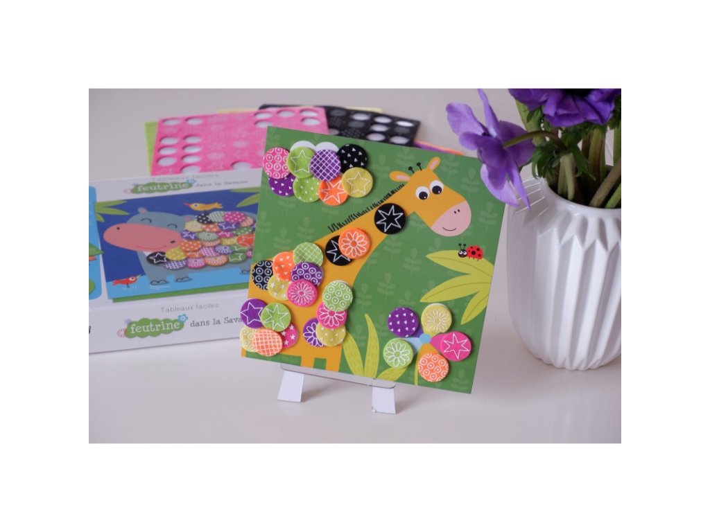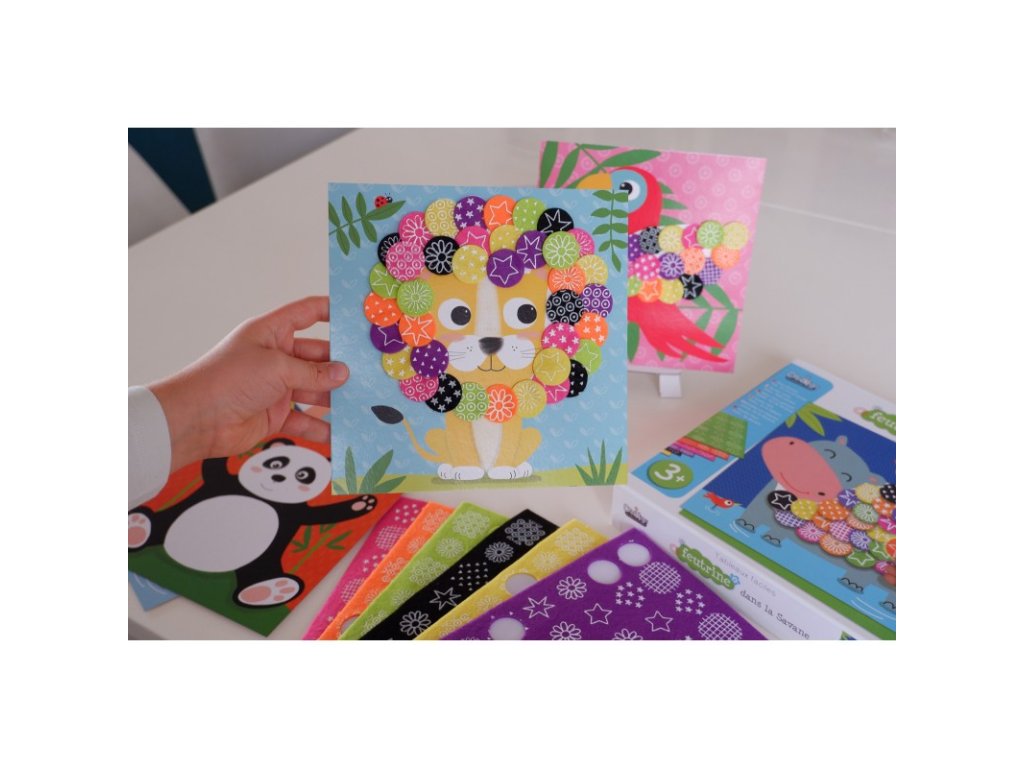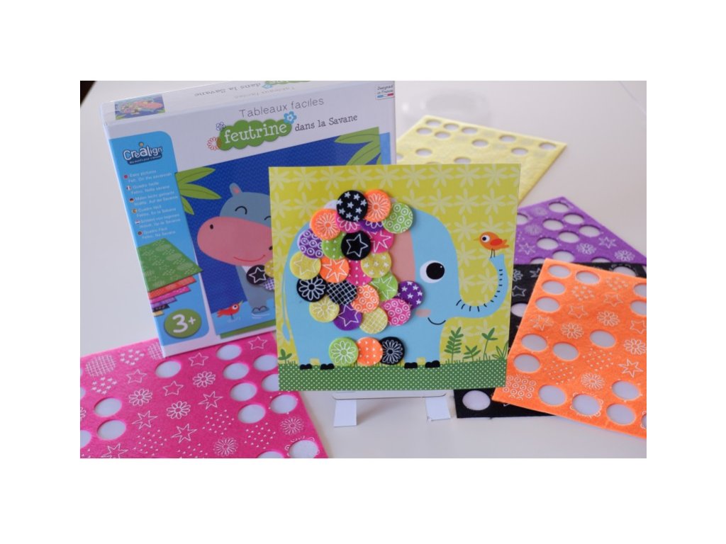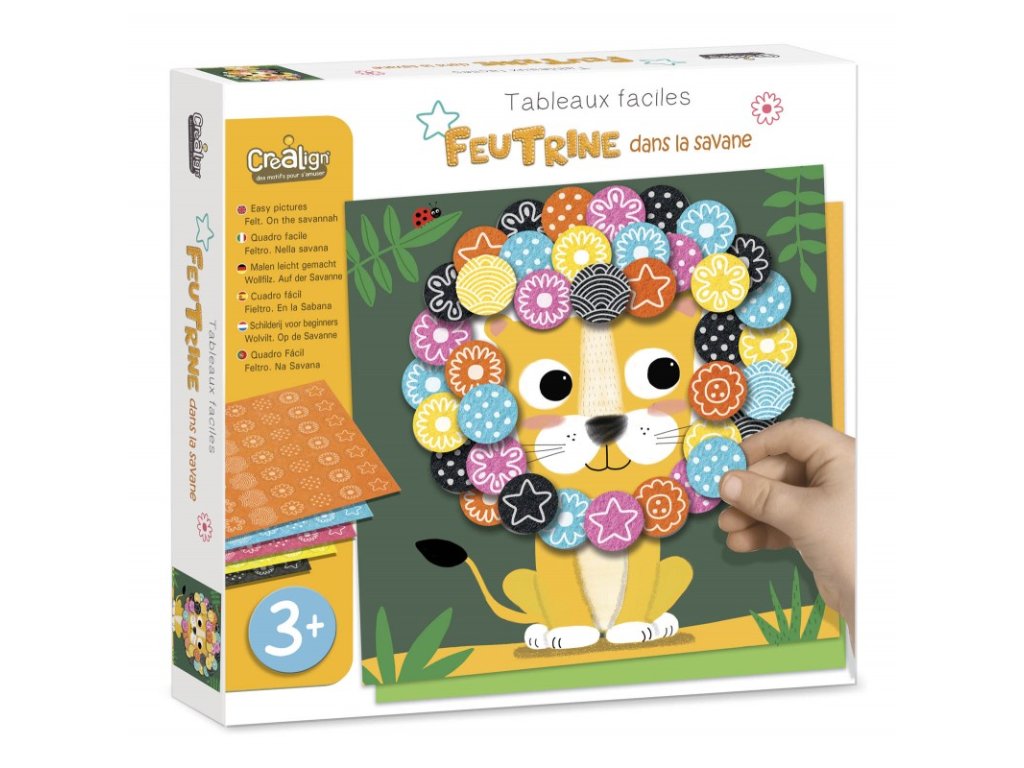 Tvorenie z filcu Na savane 3+ Vytvor si hebučké mozaiky! Kreatívna súprava pre deti Tvorenie z filcu Na savane od francúzskej značky Crea Lign z radu Jednoduché obrázky je vhodná už pre deti od 3 rokov. Obsahuje 6 podkladových obrázkov a 6 hárkov farebných a vzorovaných filcových samolepiek. Vďaka nim si deti všetky obrázky jednoducho dotvoria a vzniknú im originálne mozaiky. Nechýba ani 1 stojan na následné vystavenie obrázkov.S Crea Lign sa deti učia nové umelecké techniky Tvorenie z filcu podporuje rozvoj jemnej motoriky, predstavivosti aj kreativity. Produkt je vysoko kvalitný a bezpečný, rovnako ako všetky ostatné výrobky francúzskej značky Crea Lign. Jej cieľom je vyvíjať kreatívne potreby a hry, ktoré podporujú rozvoj detí a umožňujú každému z nich nájsť to, čo ho baví.Dodatočné parametre
