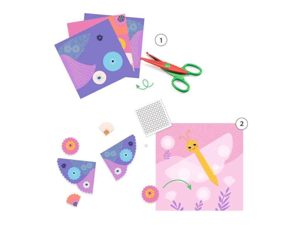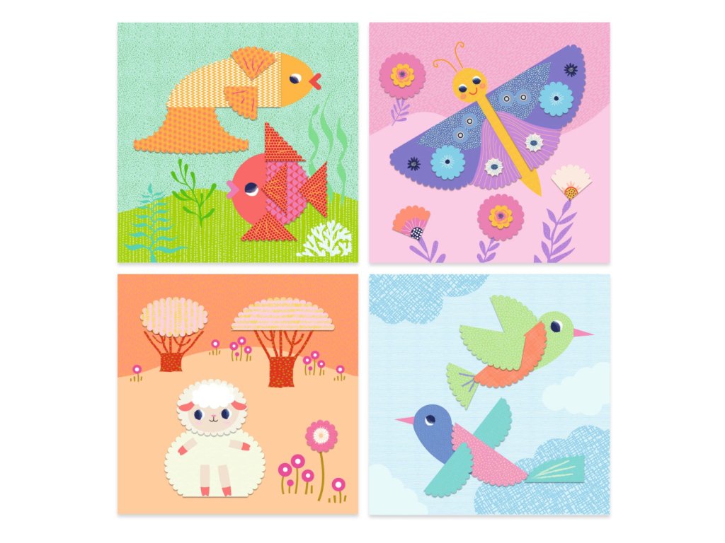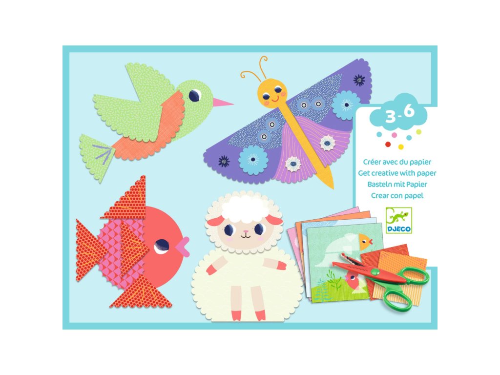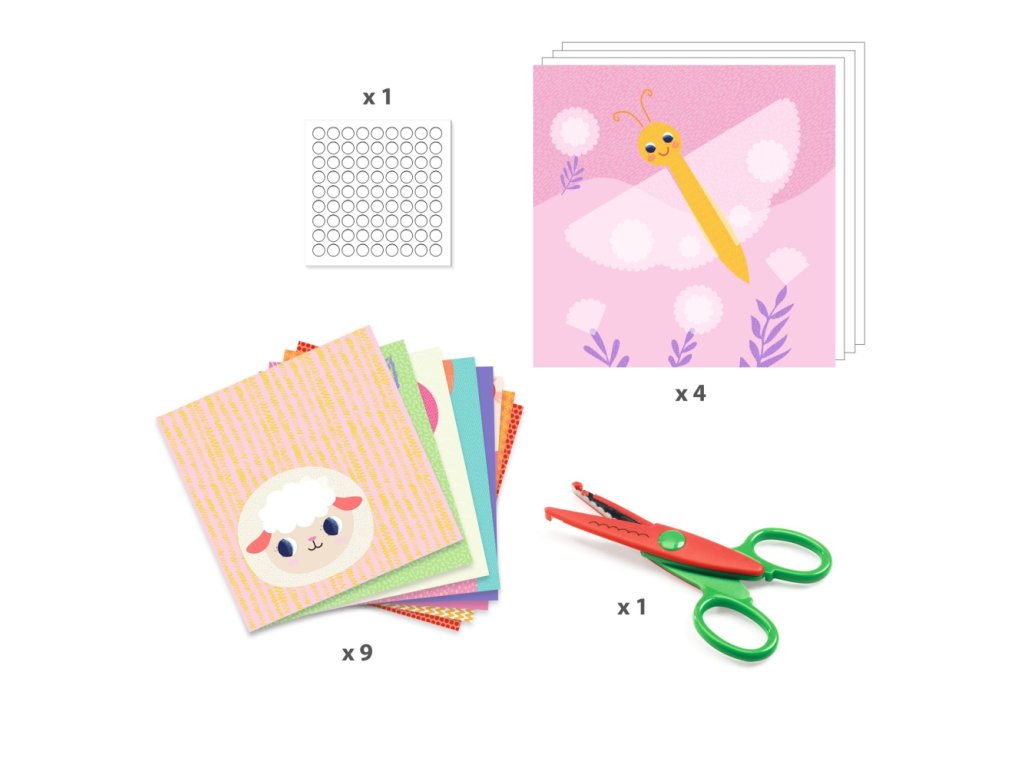 Tvorenie z papiera Zvieratká Kreatívna sada 4 obrázkov zvieratiek na dotvorenie ozdobnými papierovými tvarmi. Dieťa vystrihne z farebných vzorovaných papierových hárkov tvary, ktorými doplní ilustrácie na obrázkoch. Papiere prilepí obojstranne lepiacimi krúžkami, vďaka čomu nezostanú na papieri žiadne stopy po lepidle. Nožnice sú dekoračné a obojstranné, na oblúčiky smerujúce von alebo dnu. Výsledkom budú koláže v jemných farbách s oblúčikovým vzorom.Obsah: 4 obrázky na dotvorenie, 9 papierových hárkov na strihanie, 1 dekoračné nožnice na strihanie vlniek, 1 hárok obojstranne lepiacich krúžkov, obrázkový návodRozmery obrázkov: 21 x 21 cmDodatočné parametre