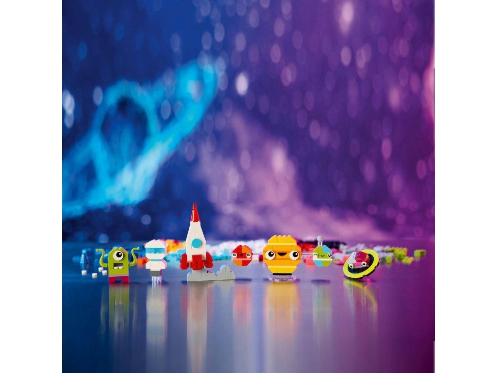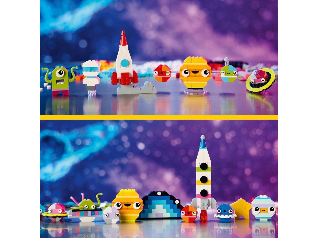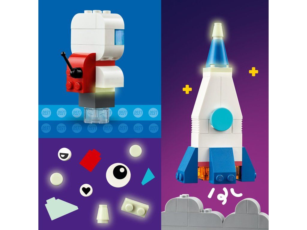 Hračkárske LEGO® Classic Tvorivé planéty (11037) vezme mladých astronautov a pozorovateľov hviezd vo veku od 5 na cestu tvorivého objavovania. Ľahko zostaviteľná hračkárska slnečná sústava, astronaut a model raketoplánu sú ideálne pre deti, ktoré chcú stavať, hrať sa a odvážne sa vydať tam, kam sa ešte žiadny staviteľ LEGO nevydal! Z farebných kociek si deti môžu postaviť hračkársku kozmickú loď, mimozemšťana, astronauta a mini slnečnú sústavu vrátane Marsu, Zeme, Slnka a Saturnu s prstencami. Vesmírne modely si potom môžu prispôsobiť pomocou alternatívnych farieb, tvarov, očí, výrazov a stojana, vďaka ktorému možno model otáčať. K dispozícii sú dokonca aj dieliky, ktoré svietia v tme a bude ich vidieť aj v noci. Vesmírna kreativita pokračuje návrhmi na alternatívne stavby vrátane kompletnej slnečnej sústavy s 8 planétami. Návod a iné digitálne funkcie sú k dispozícii aj v aplikácii LEGO Builder. Hračky zo série LEGO Classic sú plné nápadov a inšpiratívnych tipov a umožňujú rodičom podeliť sa o zábavné a dôležité okamihy vývoja so svojimi deťmi.Dodatočné parametre