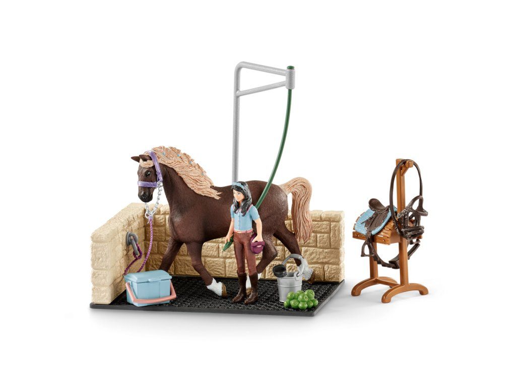 Klubový mycí kút s Emily a Lunou zo Schleich® Horse Club je veľmi moderný. Plne pohyblivá figúrka Emily kladie sedlo a uzdu na držiak, priväzuje ohlávku svojej pôvabnej holštýnskej kobyly Luny a v mycom kúte jej čistí srsť hrebeľom a kefou z krabice na hygienické pomôcky. Vodná hadica visí na pohyblivom ramene. Kone tak možno ľahko sprchovať zo všetkých strán. Protisklzová guľatá gumová podložka zabezpečuje počas osviežujúcej sprchy bezpečné stanie koňa. Emily dokáže sedieť, stáť a brať predmety. Figúrka, sedlo a uzda sú odnímateľné! Sada obsahuje: 1x dievča, 1x holštýnska kobyla, 1x sedlo, 1x uzda s opratami, 1x ohlávka, 1x mycí kút, 1x zelené jablko, 1x držiak na sedlo, 1x box s hygienickými potrebami, 1x magenta hrebeľ, 1x kefa, 1x vedro, 1x prilba. Figúrky Schleich sú mimoriadne detailné, láskovo maľované a umožňujú deťom hrať sa a zároveň sa učiť. Nevhodné pre deti do 3 rokov. Rozmer balenia: 24,5 x 19 x 6,6 cm. Odporúčaný vek: 5-12.Dodatočné parametre